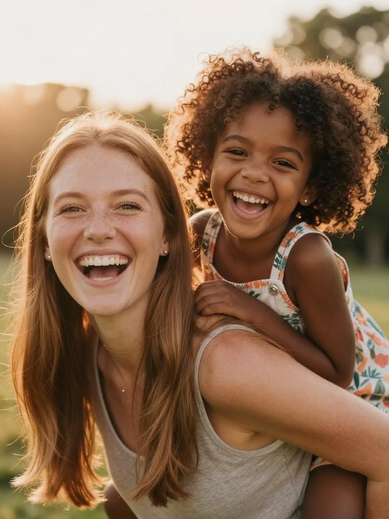 Mother and daughter, joyful close-up of a mum carrying her daughter on her back, both laughing toward the camera, young mum with long straight auburn hair and bright eyes and Black girl with bouncy curls and bright grin, mum in tank top and daughter in sundress, golden-hour sunlight with warm lens flare, soft-focus trees and sky in the background, vibrant outdoor family lifestyle stock photo, high resolution, ultra-detailed