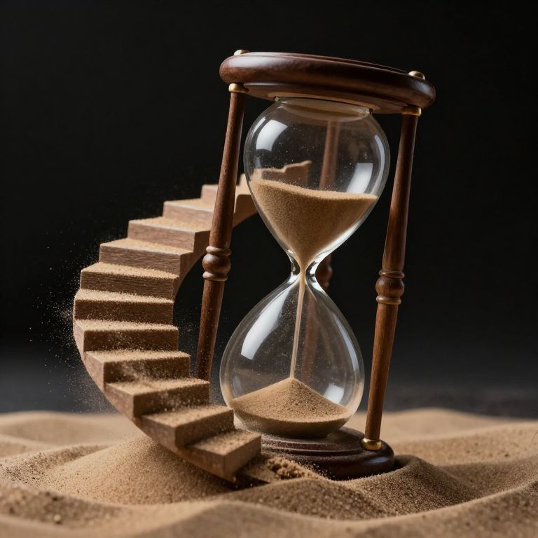 Time whispers its enigmatic dance as a staircase spirals around a spinning hourglass, its steps dissolving into sand and reforming in a perpetual cycle of transience and renewal, evoking a profound sense of both hope and melancholy.