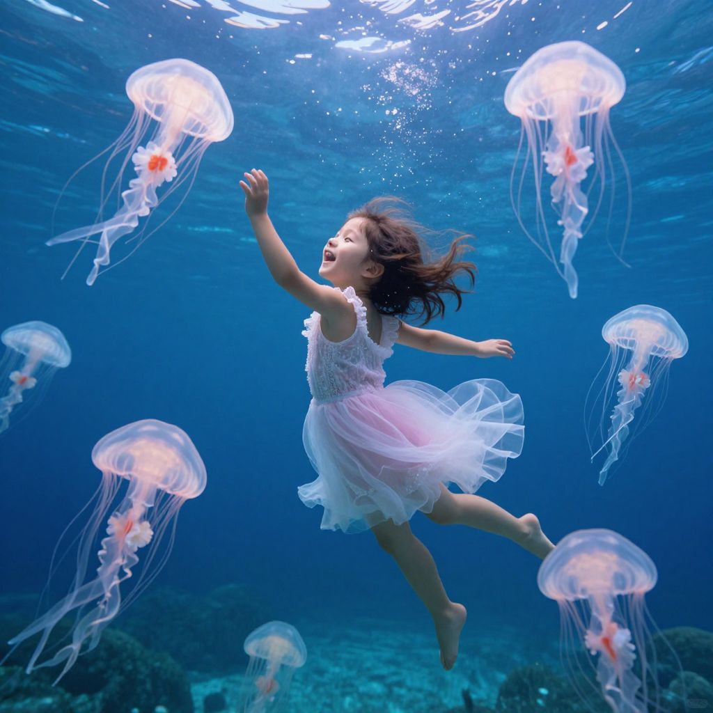 An ethereal dance of innocence and wonder unfolds beneath the sea, where a child's laughter transforms into luminous jellyfish, illuminating the depths with a symphony of joy and freedom.