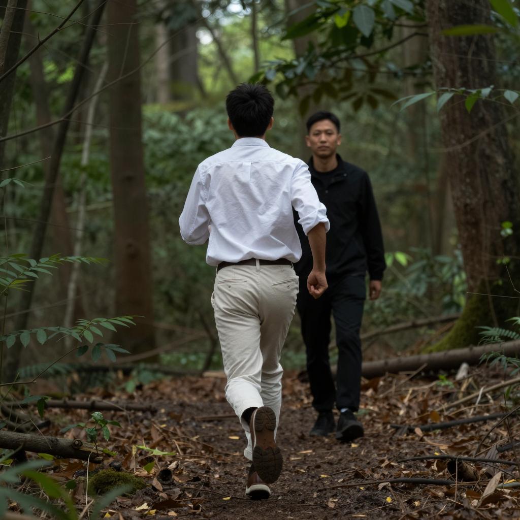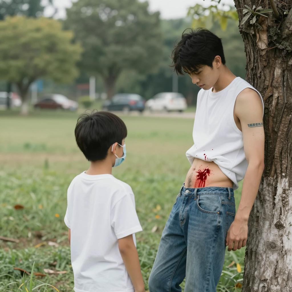 Outdoor scene with six children and one unconscious adult man lying on forest floor. Children wear blue caps, orange and blue striped neckties, and varying jackets. Adult wears white shirt, black vest, brown pants. Children stand or kneel around man, some touching him. Background includes trees, sunlight filtering through, and forest debris. Children's expressions are concerned and curious. Man's eyes are closed, head tilted back. Man's right arm is extended outward, left arm bent at the elbow. One child in striped sweater and scarf on left. One child in red jacket on right. Man's face is pale, body relaxed.