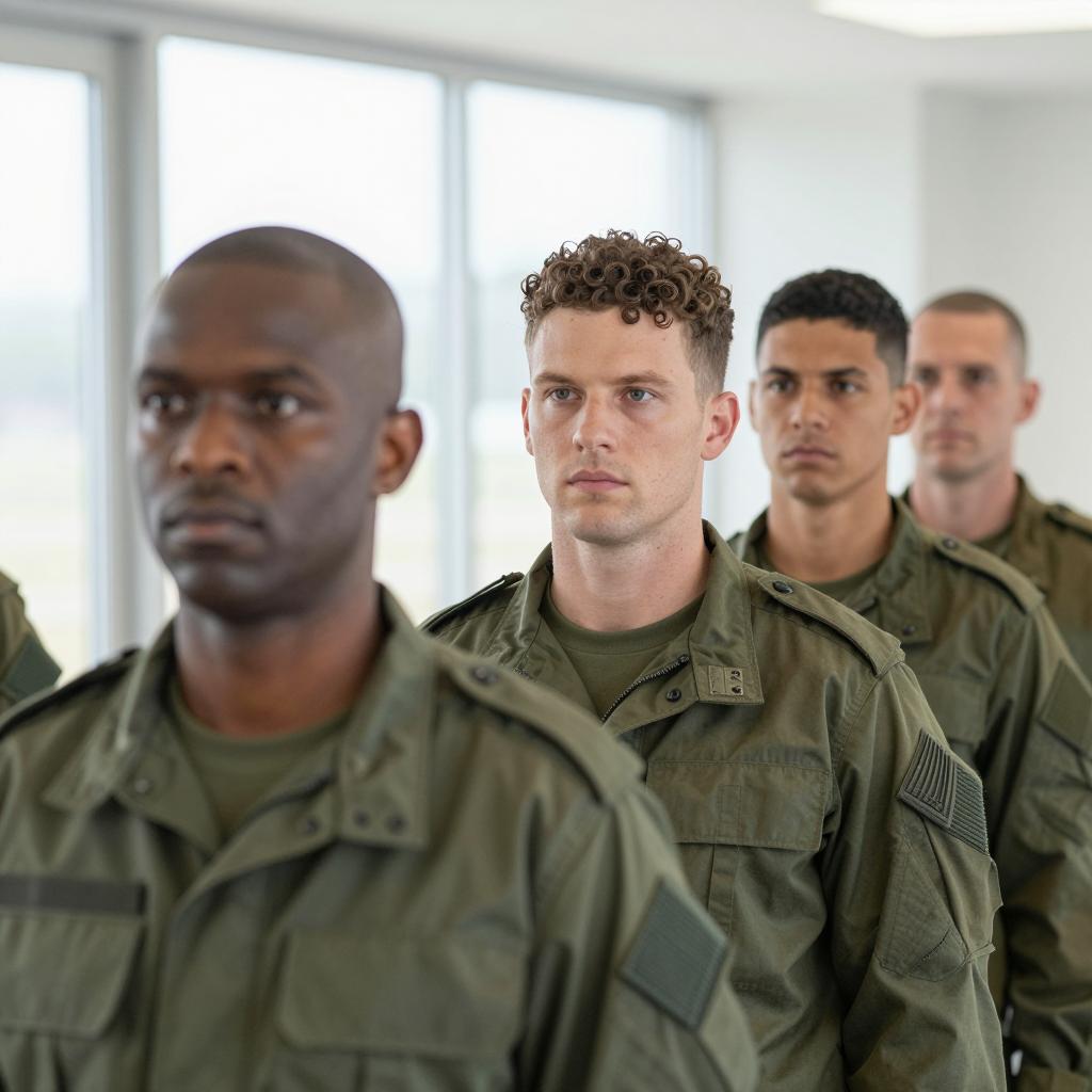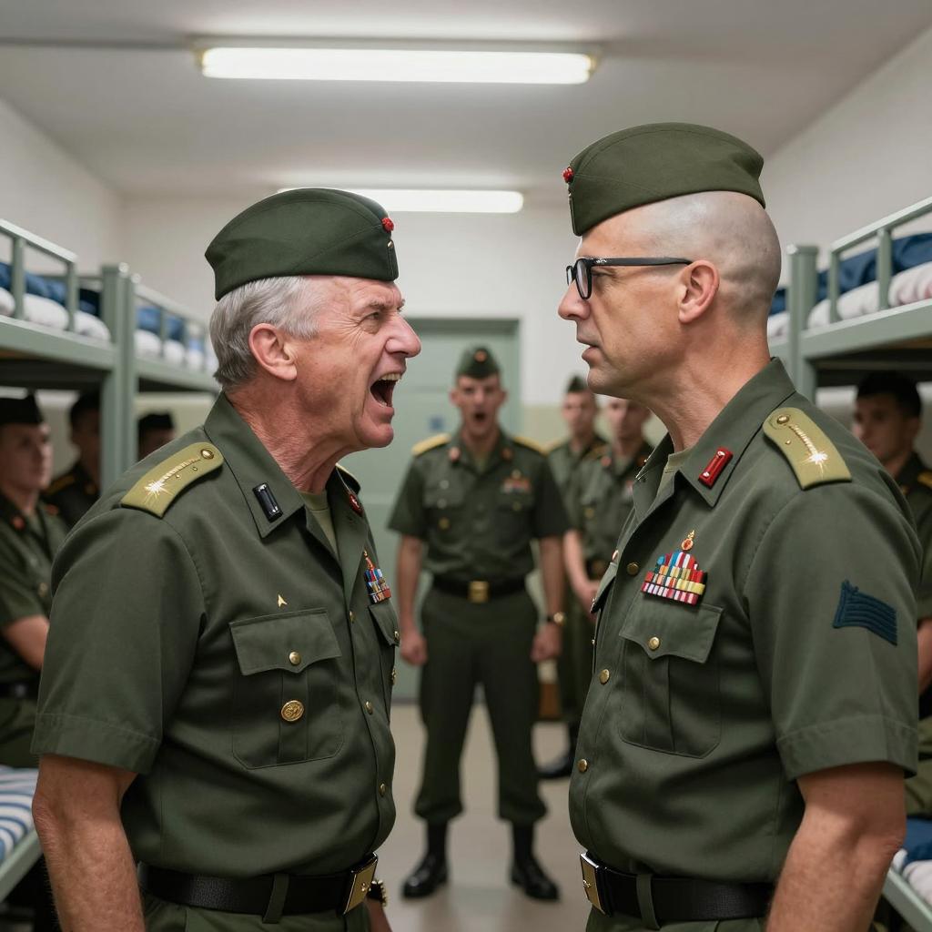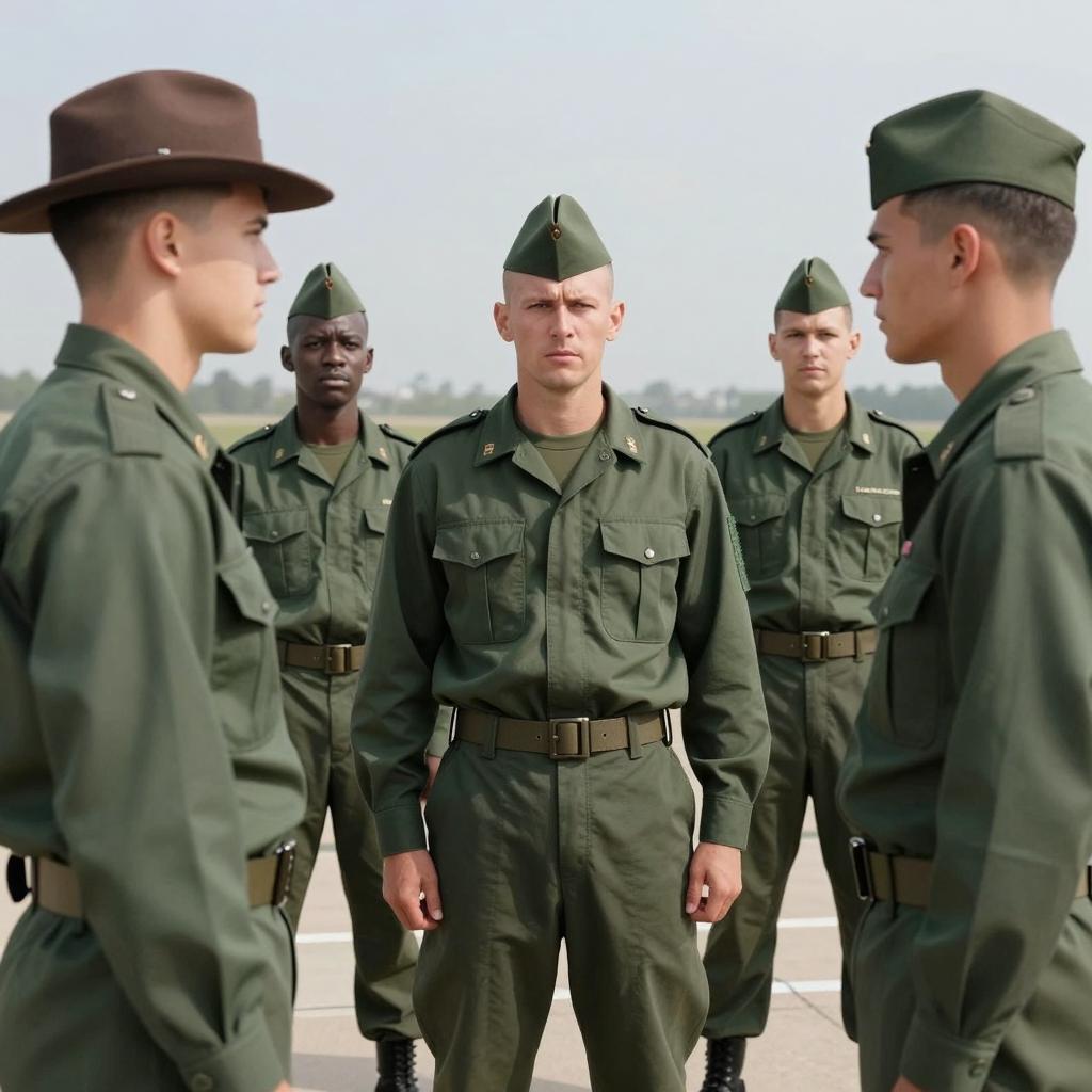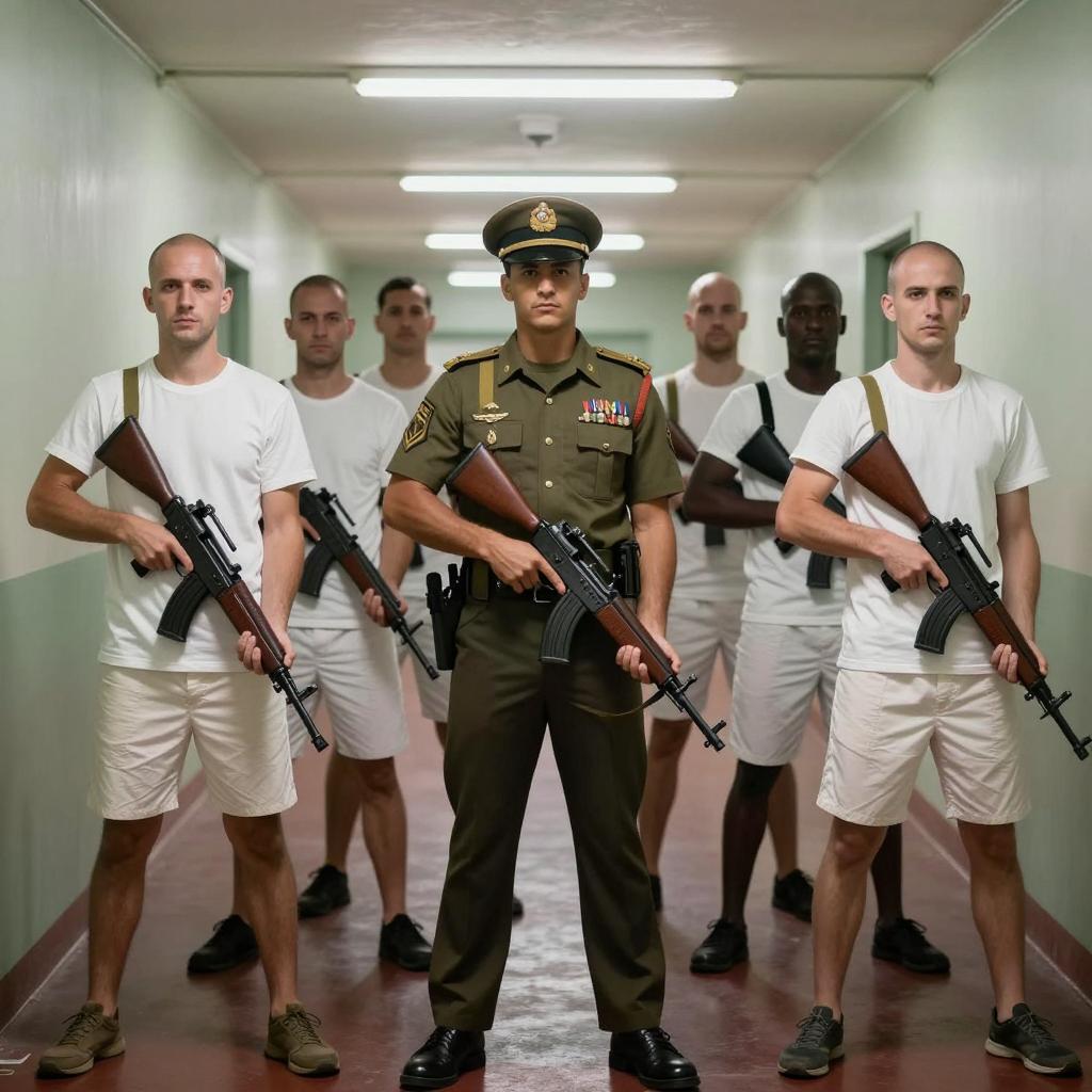 Photograph of a military drill instructor in a tan uniform and hat, shouting with mouth open, holding hands of standing, bald men in white shirts and shorts. Several men with dark skin, others with lighter skin. Drill instructor has multiple medals on chest. Indoor gym with wooden floors, mirrored walls, and ceiling lights. 8 men in background, 1 in foreground. Instructor centered, men on both sides.
