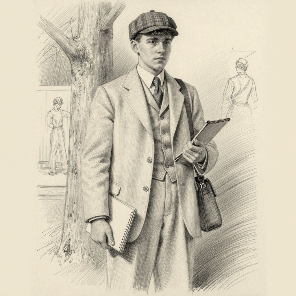In this detailed pencil sketch, a young man dressed in 1920's style attire stands confidently, holding a notepad in his hand. His outfit consists of a light-colored suit jacket, a vest, and a tie, complemented by a plaid cap and a shoulder bag. The background features a tree and a few sketches of other figures, suggesting an artistic or academic setting. The overall composition is balanced, with the man positioned centrally, and the tree and sketches providing depth and context to the scene. The interplay of light and shadow on the man's clothing and the surrounding elements creates a sense of realism and dimensionality.