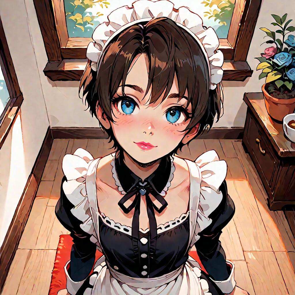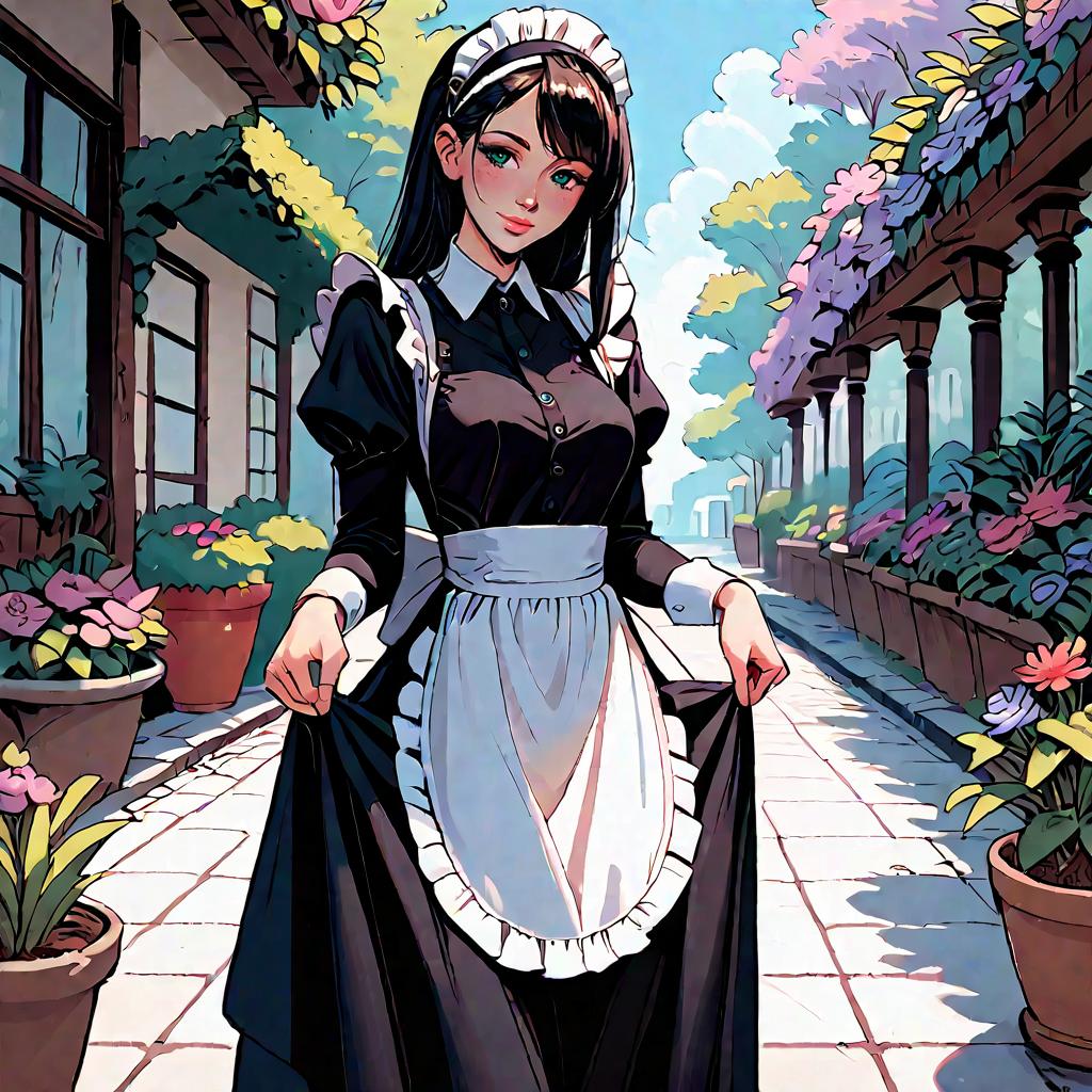 Score_9, score_8, aatakane, solo, long hair, hairband, medium breasts, maid, maid headdress, apron, black dress, skirt hold, smile, garden, standing