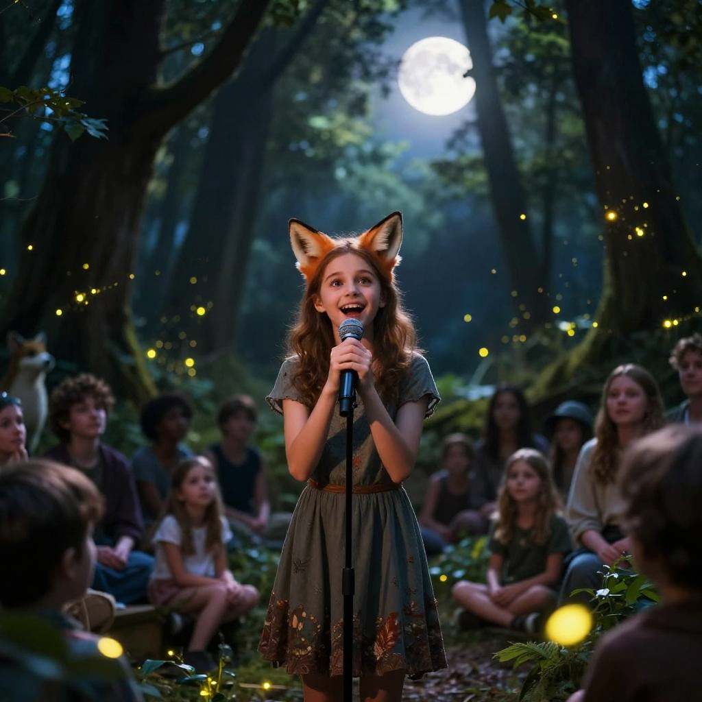 Cinematic film still In the heart of the forest, a girl with fox ears holds a microphone and takes center stage for a captivating woodland concert. Her eyes twinkle with excitement, and her fox-like ears twitch playfully as she commands the audience's attention. A soft spotlight cuts through the trees, casting a warm glow on her, while fireflies illuminate the surrounding air with a magical radiance. Her voice resonates through the enchanted forest, mingling with the rustling leaves and soothing night sounds. With the moon as her spotlight and the creatures of the woods as her audience, she enchants them all with her melodic performance, weaving a harmonious melody into the tapestry of nature.Natural light, . shallow depth of field, vignette, highly detailed, high budget Hollywood movie, bokeh, cinemascope, moody, epic, gorgeous, film grain, grainy