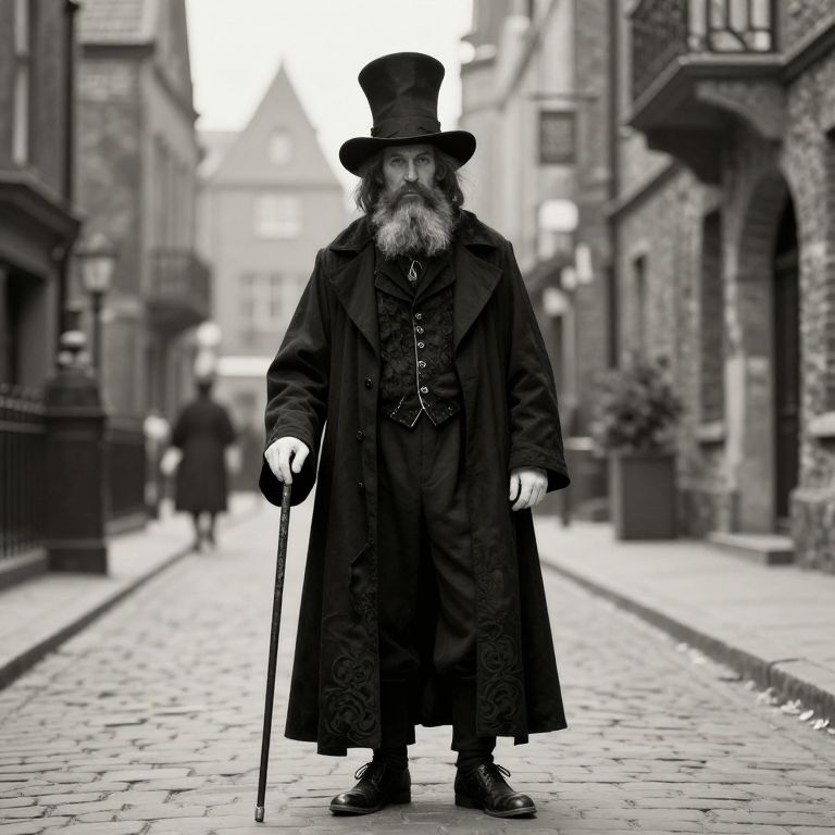 An old-timey photograph of a Victorian wizard wearing all black, complete with a tall hat, long beard, and a cane, standing in a full perspective.