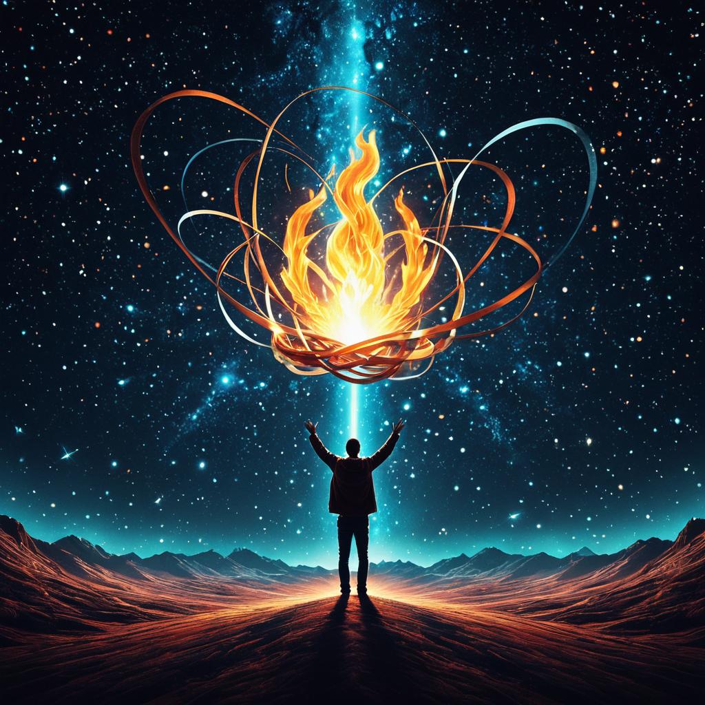 A silhouette of a man standing with arms raised in a surreal extraterrestrial landscape under a star-filled cosmic sky. Above him, an intricate glowing flame surrounded by ethereal swirling ribbons of light, symbolizing spiritual awakening and cosmic unity. The scene depicts infinite compassion and wonder in a dreamlike realm, blending vibrant galactic blues and fiery orange hues along distant mountain ridges.