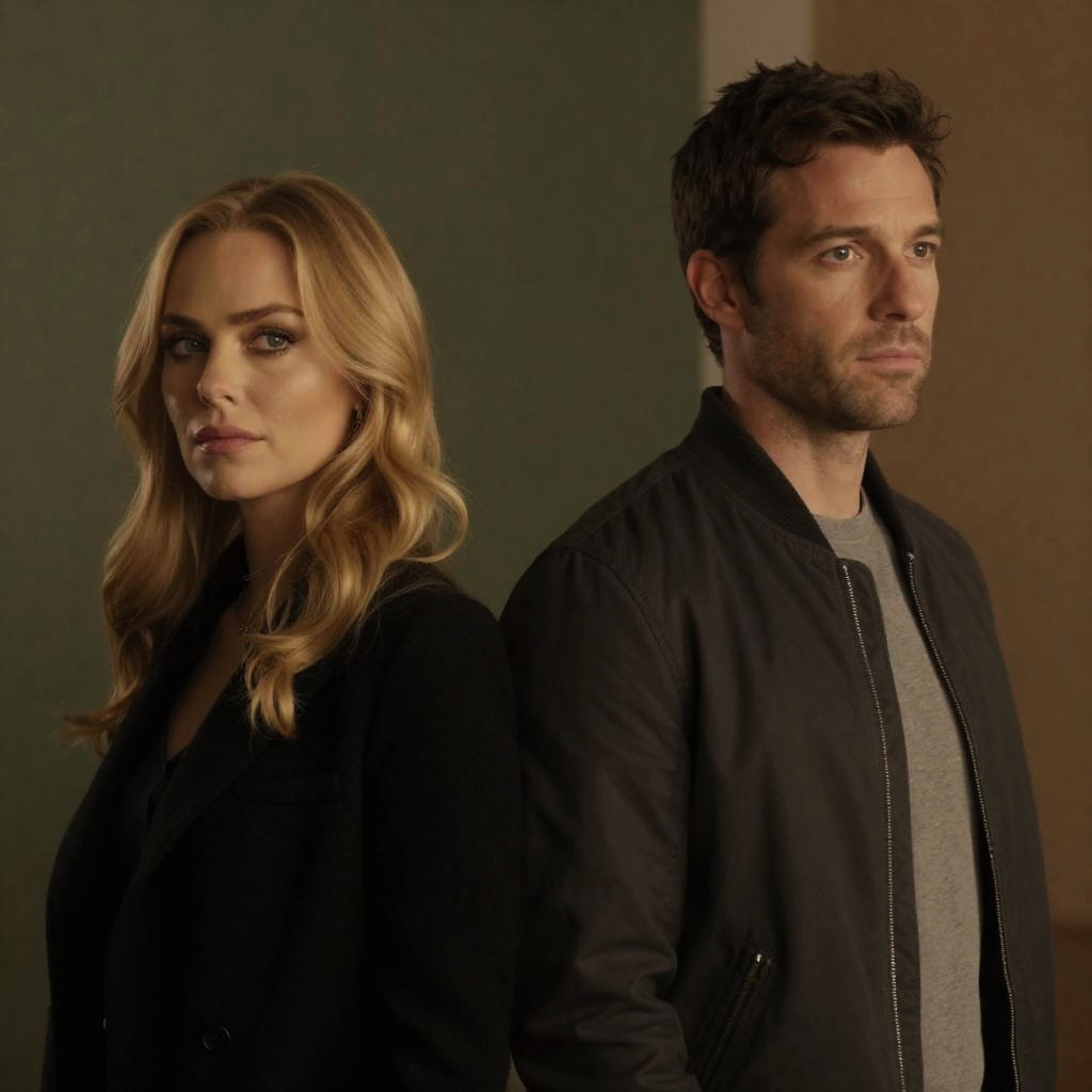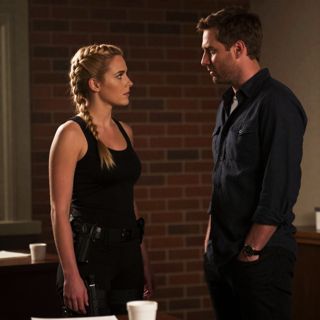 Photograph of two people standing in a dimly lit room with a brick wall background. A blonde woman with braided hair, wearing a black tank top and pants with a gun holster, stands on the left. A man with brown hair, wearing a dark button-up shirt, stands on the right, looking at her intensely. Both have serious expressions. A small white container is on a table in the foreground. The man has his hands in his pockets.