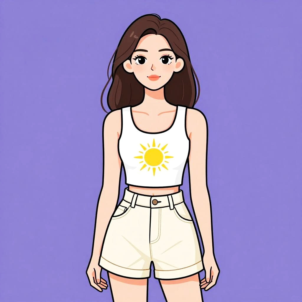 Woman with pretty face and pretty hair. Woman, casual summer, white tank top with a sun emblem print on the chest, scoop neckline, sleeveless, high-waisted cream shorts, pleated front, belt loops, relaxed fit, side pockets, plain background. --sref 1467