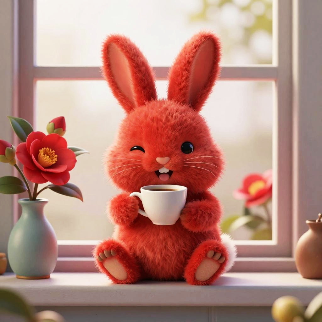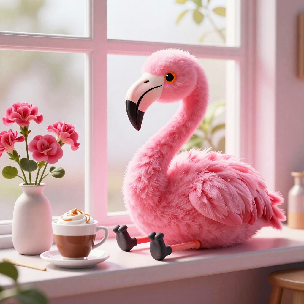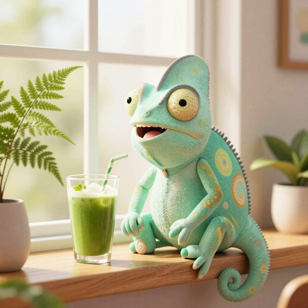 A whimsical, cute, fluffy lime green cartoon frog sitting on a windowsill with a cup of matcha latte and a vase of morning glories nearby, joyful smile, relaxed vibe, 3D fantasy drawing style, cozy indoor setting, high quality and detail