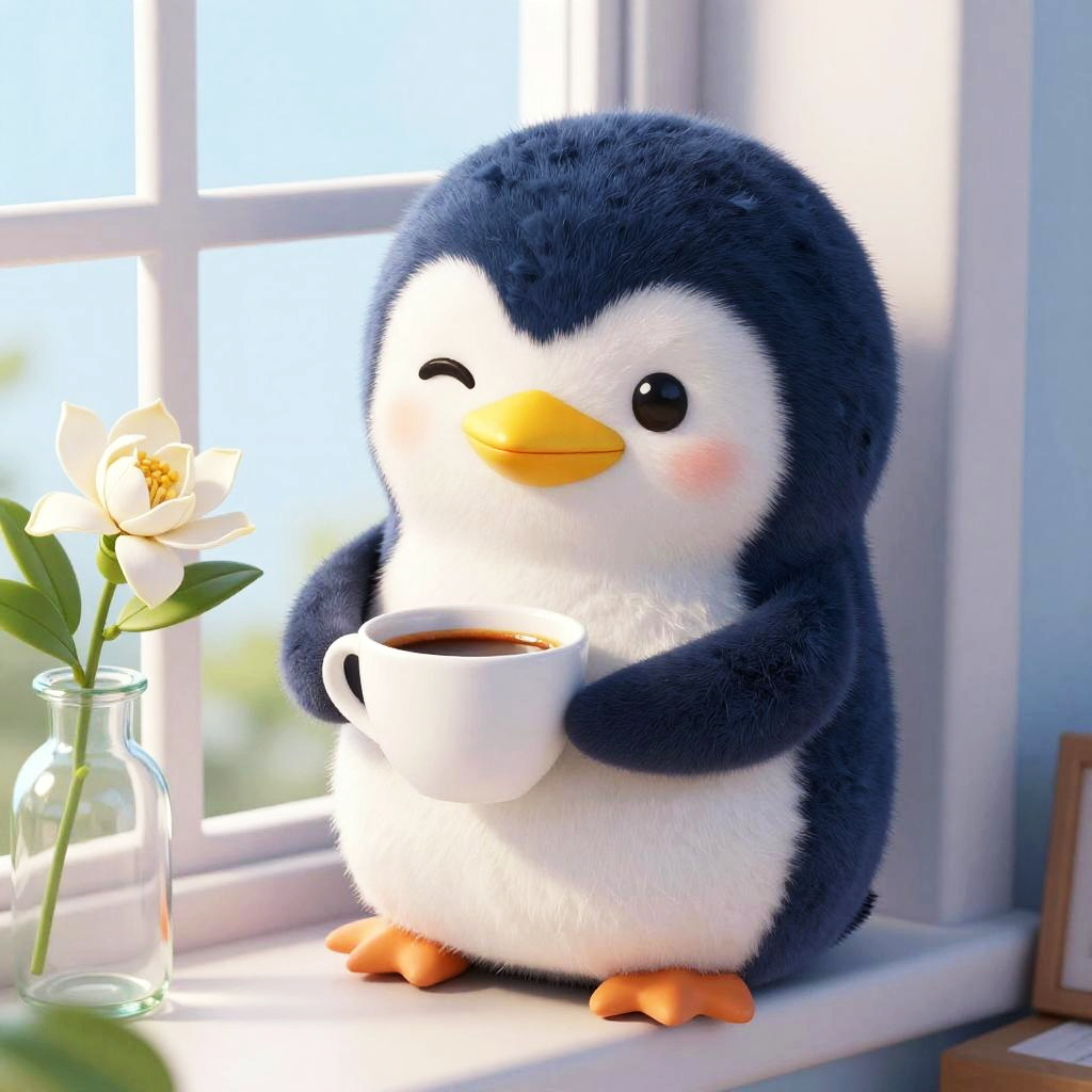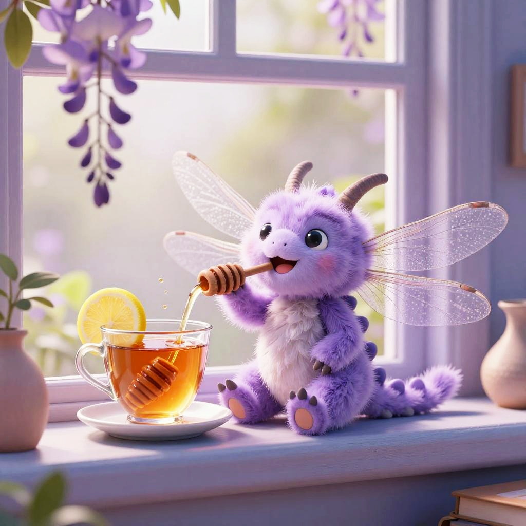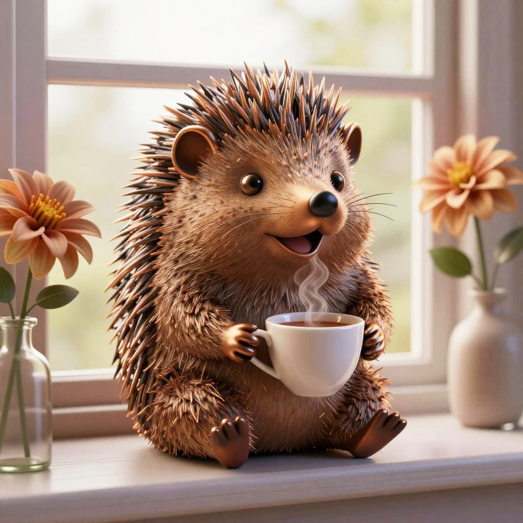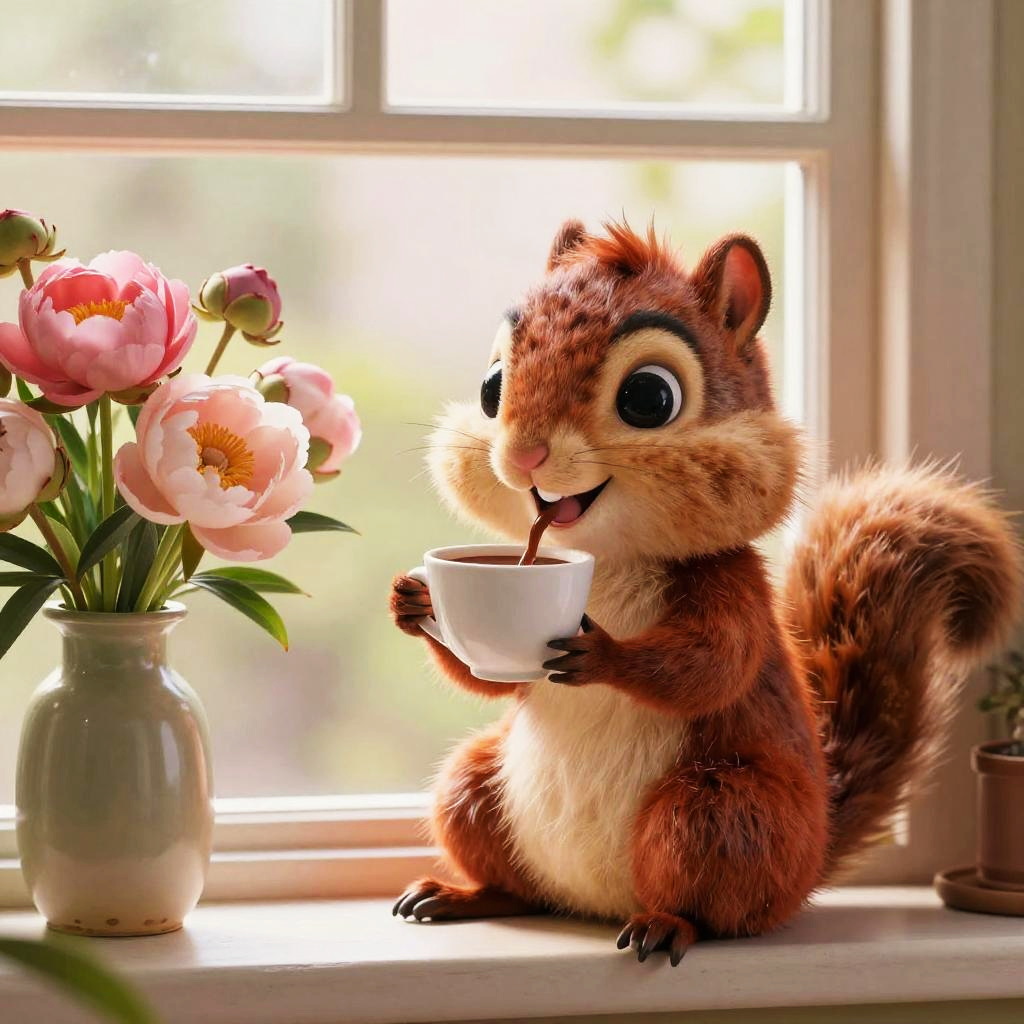 A whimsical, cute, fluffy lime green cartoon frog sitting on a windowsill with a cup of matcha latte and a vase of morning glories nearby, joyful smile, relaxed vibe, 3D fantasy drawing style, cozy indoor setting, high quality and detail