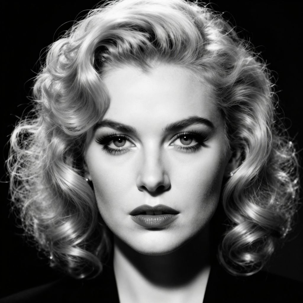 Blonde actress with curly hair in a dramatic black and white portrait, intense gaze, high contrast lighting, textured curls, classic film noir style, striking composition