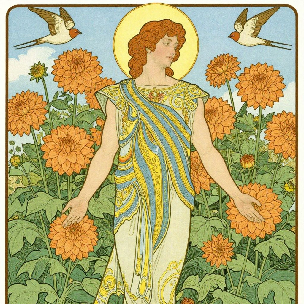 An Art Nouveau style illustration inspired by Alphonse Mucha, featuring a dignified woman with medium-length wavy auburn hair and soft expressive features. She stands gracefully amidst vibrant orange tulips, wearing an intricate green dress with floral embroidery and a golden halo around her head. The background shows a serene blue sky dotted with flying swallows, framed with botanical details in a harmonious palette of green, orange, and yellow.