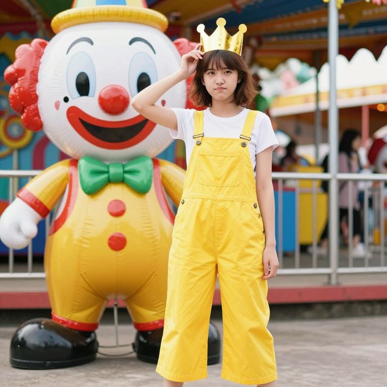 A girl in a bright yellow jumpsuit with wide legs and shoulder straps stands in a carnival atmosphere, next to a giant clown balloon, her face has a slightly mischievous expression and short brown hair, holding a paper crown with smiling eyes and a festive smile