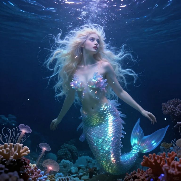 A captivating portrait in the style of surrealistic painting showcases an ethereal aquatic goddess with scales shimmering like a cascade of stardust, enveloped in an iridescent aura that exudes otherworldly grace. From a unique 'fish-eye' perspective, this celestial mermaid gazes into the distance with eyes as deep and mysterious as the cosmic abyss, her enchanting beauty highlighted by soft light dancing across her luminescent form amidst a dreamlike underwater realm adorned with glowing coral formations and delicate sea anemones. This mesmerizing image evokes a profound sense of wonder and awe, inviting viewers on a captivating journey beyond the boundaries of reality into a realm where beauty and mystery intertwine in a harmonious dance of celestial magic.