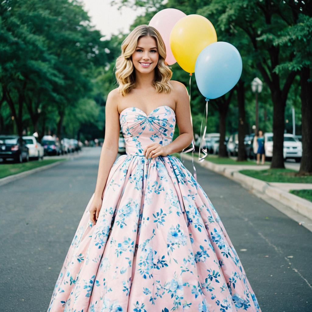 Two piece sets birthday, photograph of a smiling woman, wearing a strapless pink and blue floral ball gown, standing in a street filled with pastel balloons, daytime, green trees in background, summer, fair skin, wavy blonde hair, bright makeup, light pink, blue, and white balloons, floral patterns on dress, outdoor setting, soft lighting, fashionable, cheerful, elegant, full-body shot
