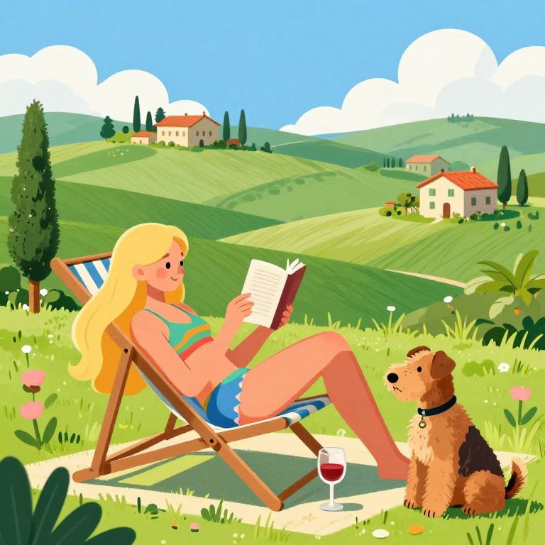 A vibrant digital illustration depicts a blonde woman with long hair, wearing a blue bikini and striped towel, reclining on a wooden lounge chair in a lush, green hillside landscape. She reads a book, while a brown and black dog with a collar sits beside her. A glass of red wine rests on the ground near her chair. The background features rolling hills, scattered houses with red roofs, tall cypress trees, and a bright blue sky with fluffy white clouds. Pink flowers and green grass surround the scene, adding to the serene, picturesque setting.