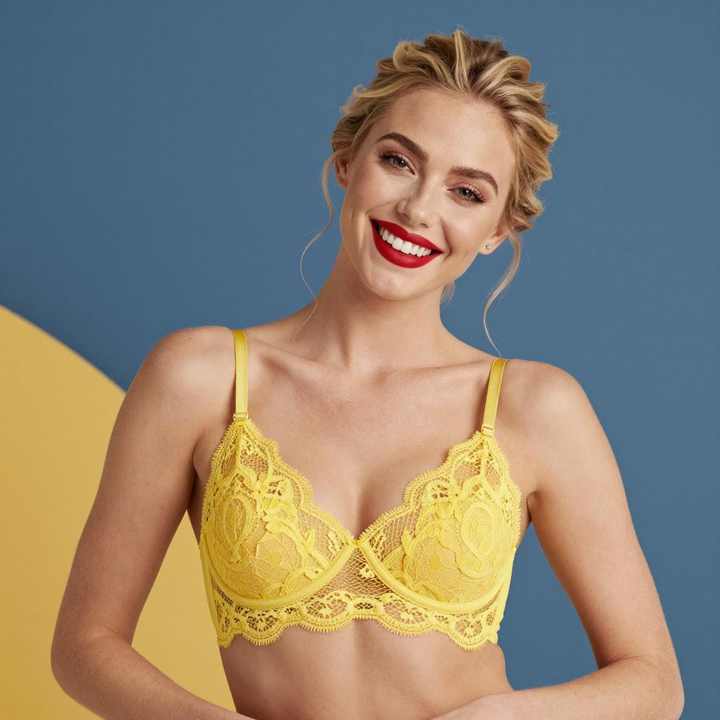 Photograph of a smiling woman with fair skin and long blonde hair, wearing a blue lace bra, holding her hair with one hand, wearing a pink smartwatch on her left wrist, standing against a plain beige background.