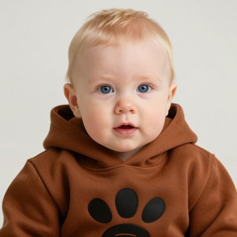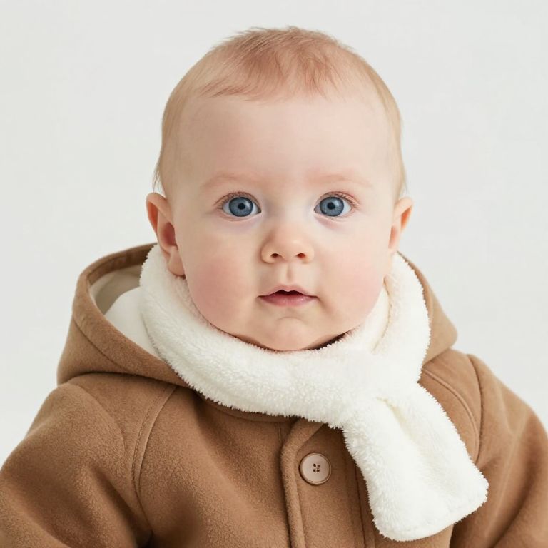 A baby with blue eyes is wearing a brown coat with a white collar and a white scarf.