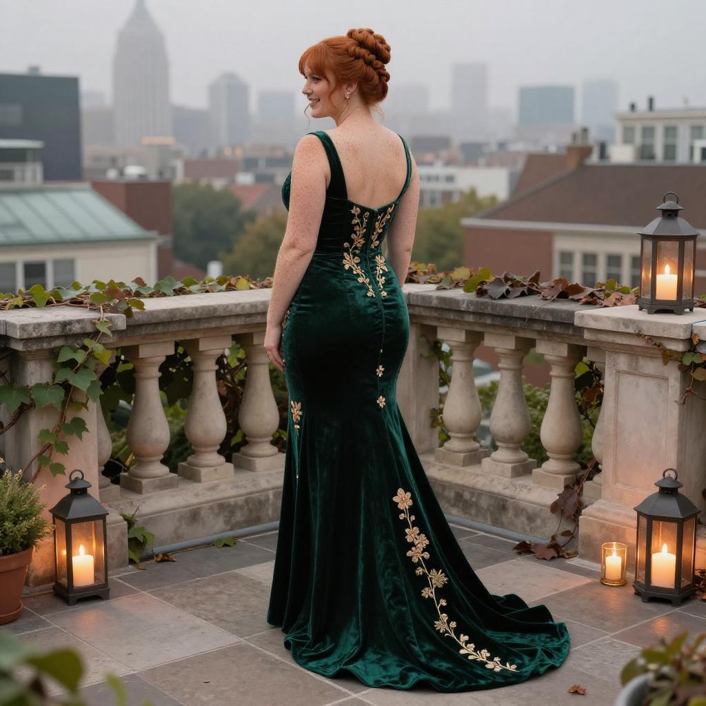 Masterpiece, best quality, (photorealistic:1.4), full body, ultra-detailed photo of a tall curvy red-haired woman with a high braided bun and sun-kissed freckles, wearing emerald green backless corseted velvet gown with a sweeping train and delicate gold floral embroidery down the spine, standing in a rooftop conservatory with ivy-covered stone balustrades, scattered amber lanterns, and a fog-laced city skyline at dusk, smiling with an hourglass silhouette, viewed completely from behind