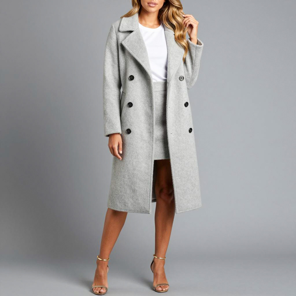 Photograph of a woman with light brown skin and long blonde hair. She wears a light gray, oversized, belted coat with large black buttons, a white t-shirt, and a short matching skirt. She has gold ankle bracelets and metallic sandals. She stands with her left hand touching her hair, her right hand hanging by her side. The background is a solid gray. Her legs are slightly crossed.