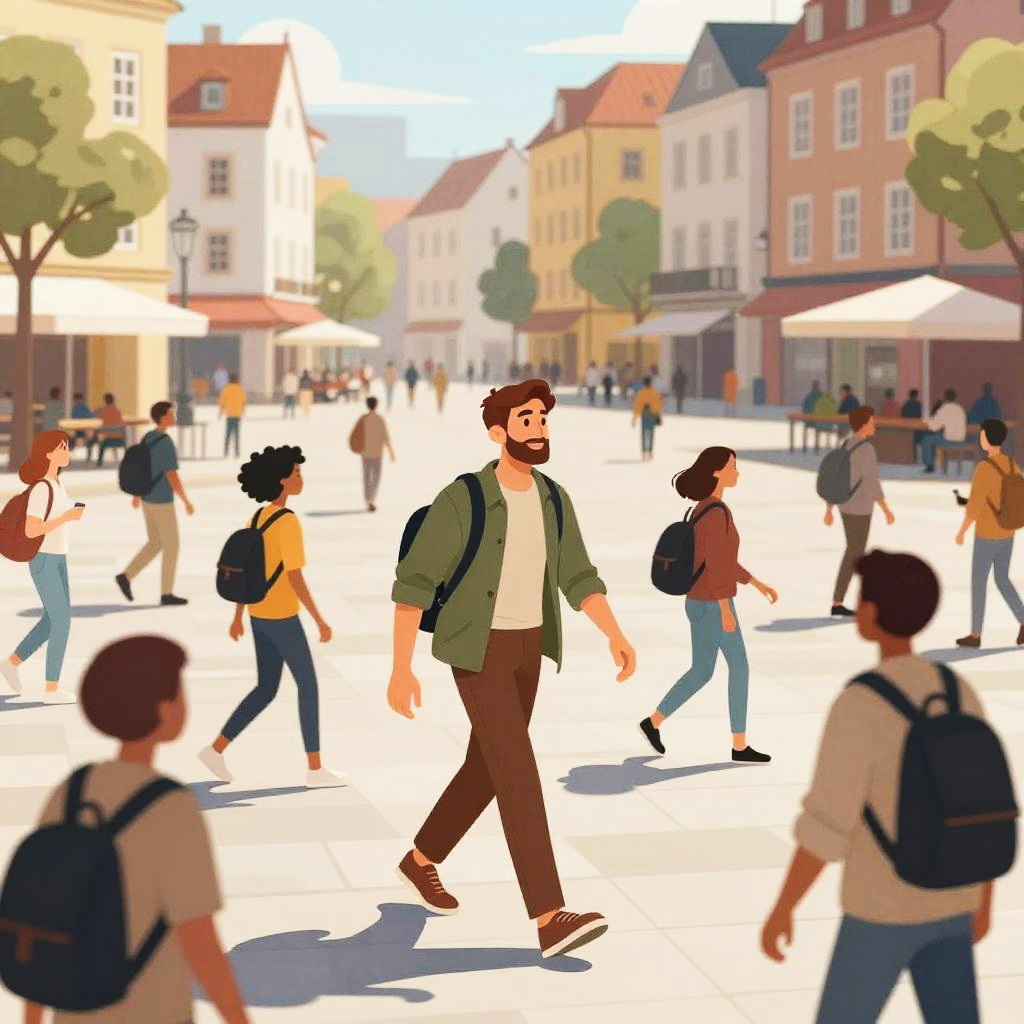 Kasselakis leading a diverse group of people through a bustling city square, dynamic composition capturing movement and unity, bright and optimistic color scheme, digital illustration with cinematic depth.