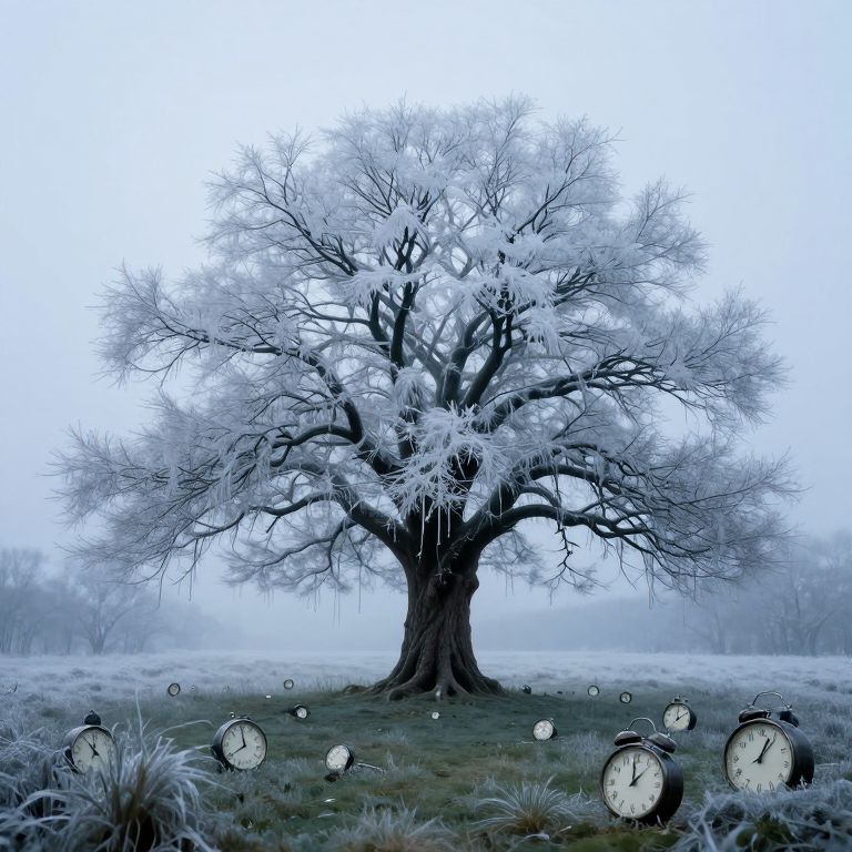 Amidst a meadow of suspended moments, a luminous tree of frozen time stands as a silent sentinel, its branches whispering the weight of eternity while clocks scattered below tickle the threshold of midnight, each a fragment of a story untold.