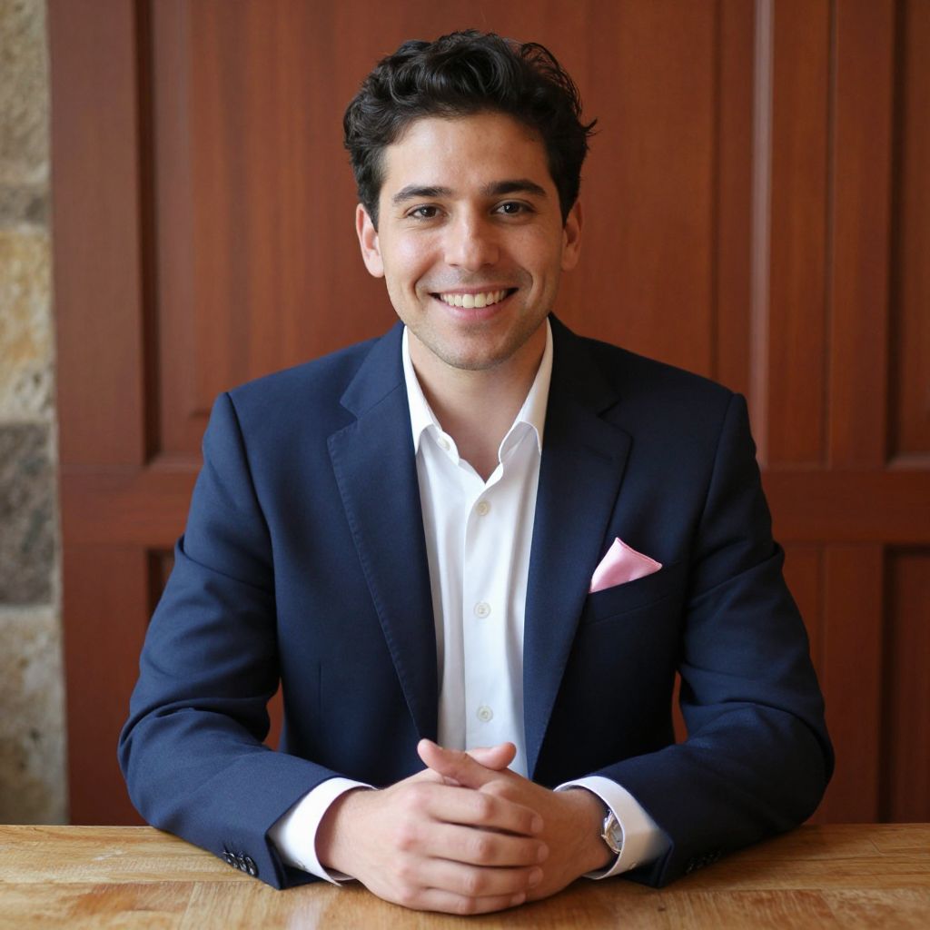 Photograph of a smiling man with short, dark hair and light skin, sitting at a wooden table. He's wearing a dark blue suit, white dress shirt, and a pink pocket square. His hands are clasped in front of him. The background features a warm, reddish-brown paneled wall with some stone on the left. He looks approachable and confident.