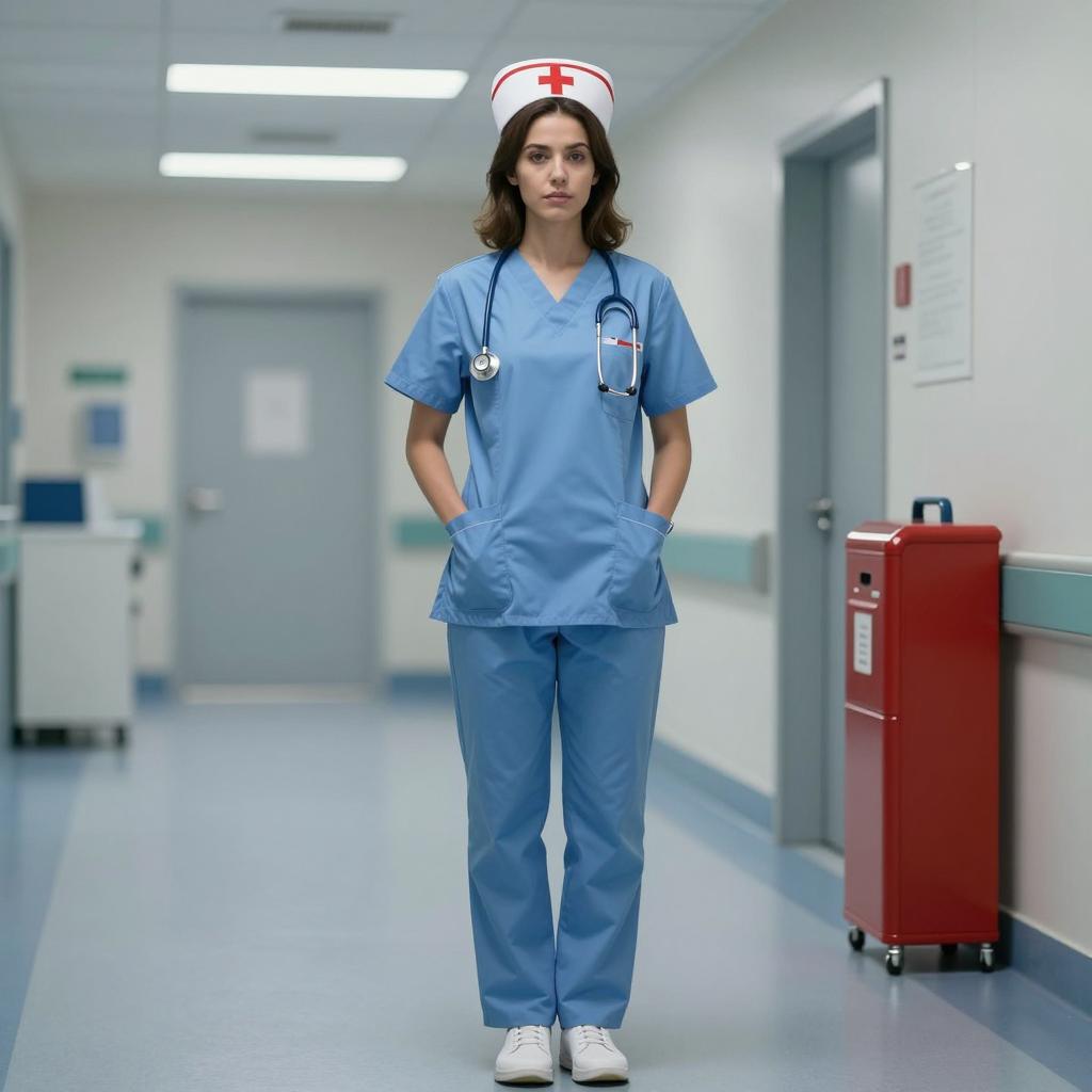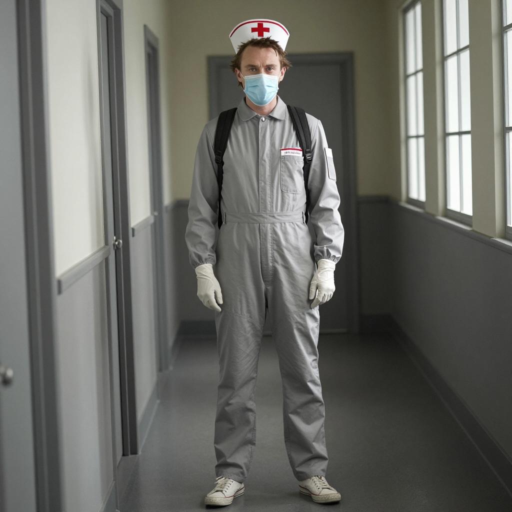 Heath ledger costume nurse, photograph of a man standing in a dark hallway, wearing a white nurse cap with red cross, gray jumpsuit, white gloves, blue surgical mask, white sneakers, black backpack straps, light coming from windows on the right, neutral expression, casual pose, realistic style, clear details, natural lighting