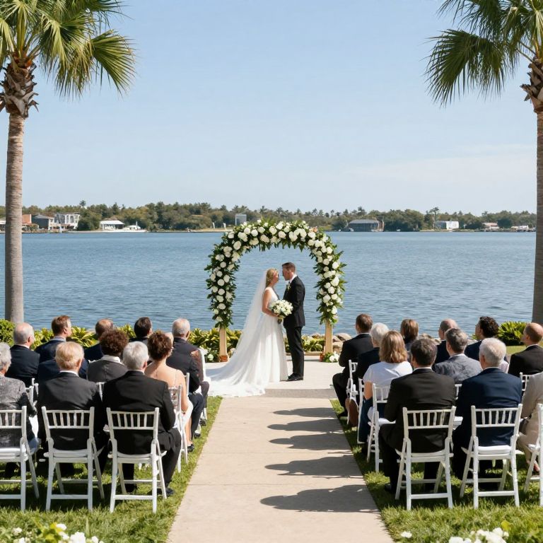 Photograph of an outdoor wedding ceremony by a lake. The bride, in a white strapless gown with a long train, and the groom, in a black suit, stand under a floral arch with white and green flowers. Guests, dressed in formal attire, sit on white chairs on either side of a concrete pathway. Palm trees flank the scene, and the calm blue lake stretches out in the background under a clear sky. The overall atmosphere is serene and picturesque.