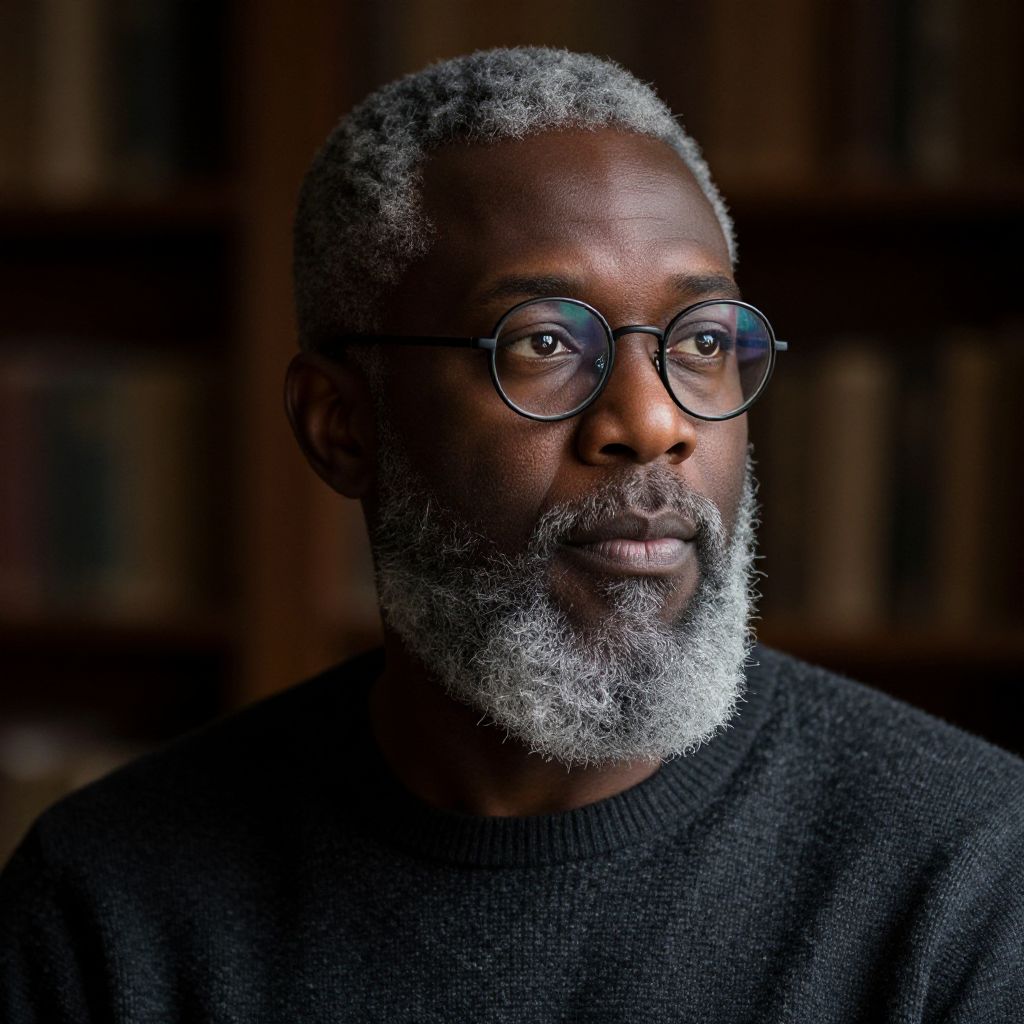 Close-up of a grey hair handsome salt and pepper beard black man, poised and thoughtful, wearing round glasses and a cozy sweater, soft-focused library background, rich textures and deep shadows emphasizing his salt and pepper beard and confident expression.