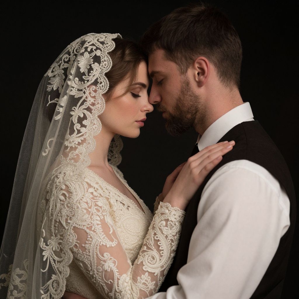 Photograph of a bride and groom in an intimate close-up, set against a black background. The bride, with fair skin and dark brown hair, wears an elaborate white lace veil and a matching lace wedding dress with sheer sleeves. She gazes softly at the groom, her hand gently touching his chest. The groom, with short dark hair and a beard, wears a white dress shirt and black vest. Their foreheads nearly touch, creating a romantic and tender moment. The intricate lace patterns contrast with the dark background, highlighting their emotional connection.