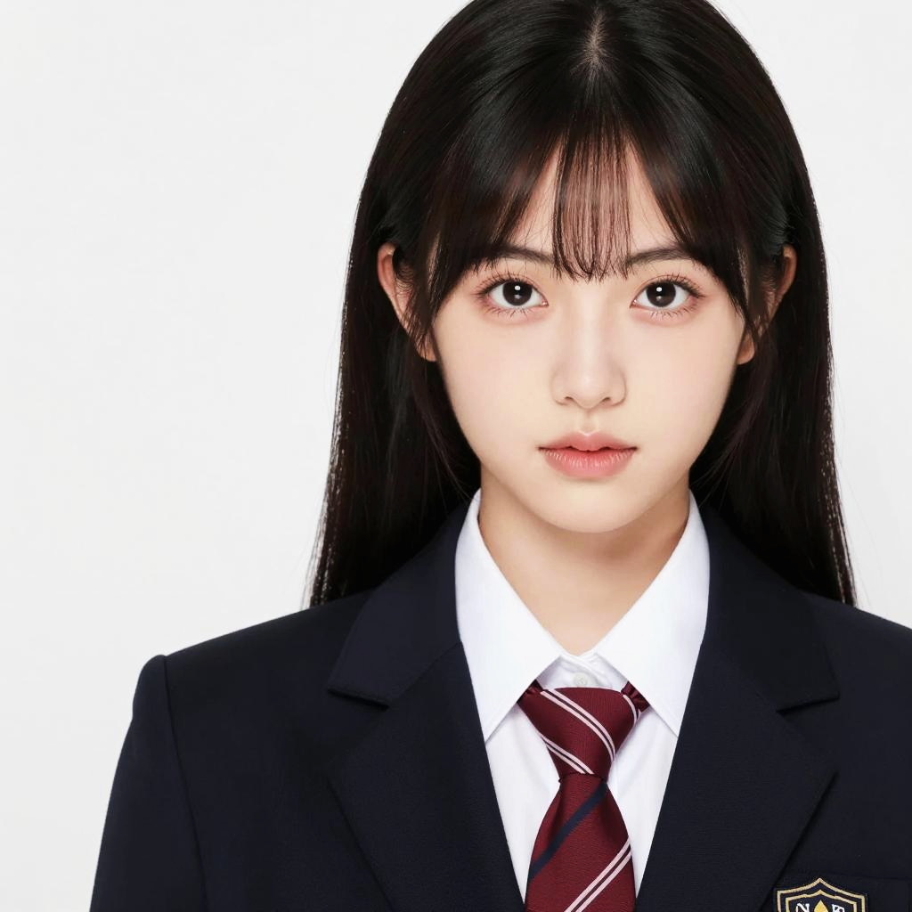Aihara Mei is portrayed in a realistic style wearing a traditional Japanese school uniform with a maroon tie and a navy blazer shrug with a school emblem. The close-up shot highlights her long black hair, gentle expression, and flawless makeup, capturing the essence of youthful elegance and school life culture.