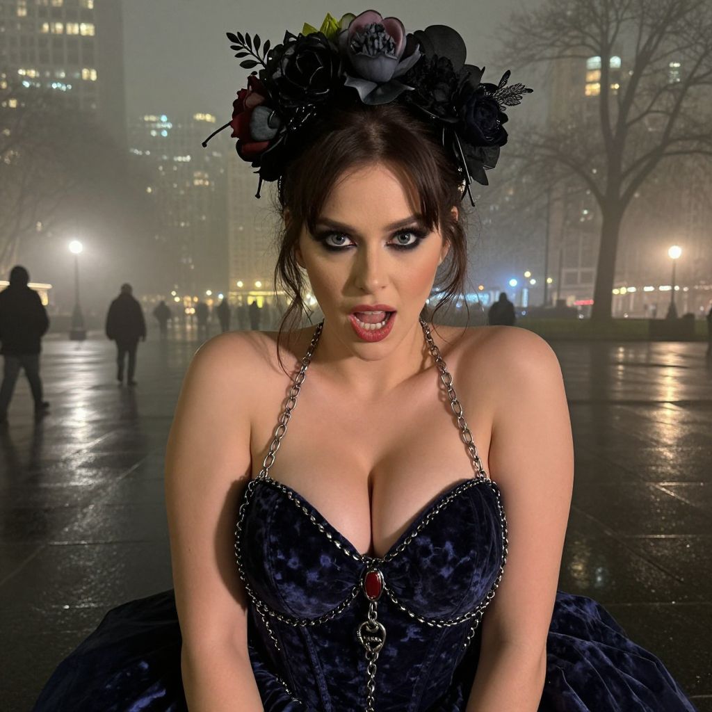 A cinematic close-up of a woman in a dramatic baddies costume, sitting in a foggy city park — her face is sharp and expressive with high cheekbones and smoky eyes, wearing a velvet gown with metallic chains and a wild floral headdress, the background shows city lights reflecting on wet pavement. The woman has big tits and cute face