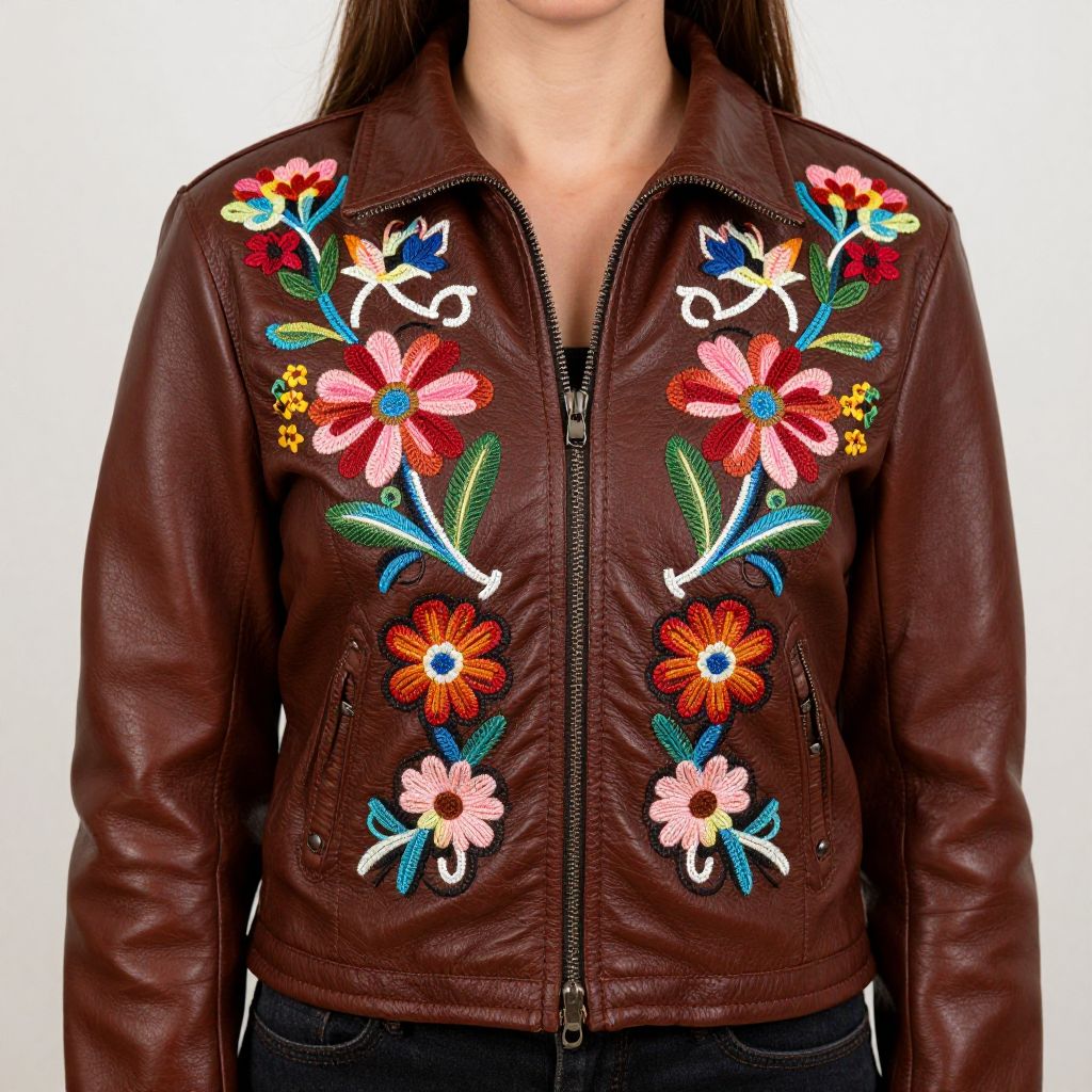 Photograph of a woman wearing a brown leather jacket adorned with colorful embroidered flowers and leaves on the front.