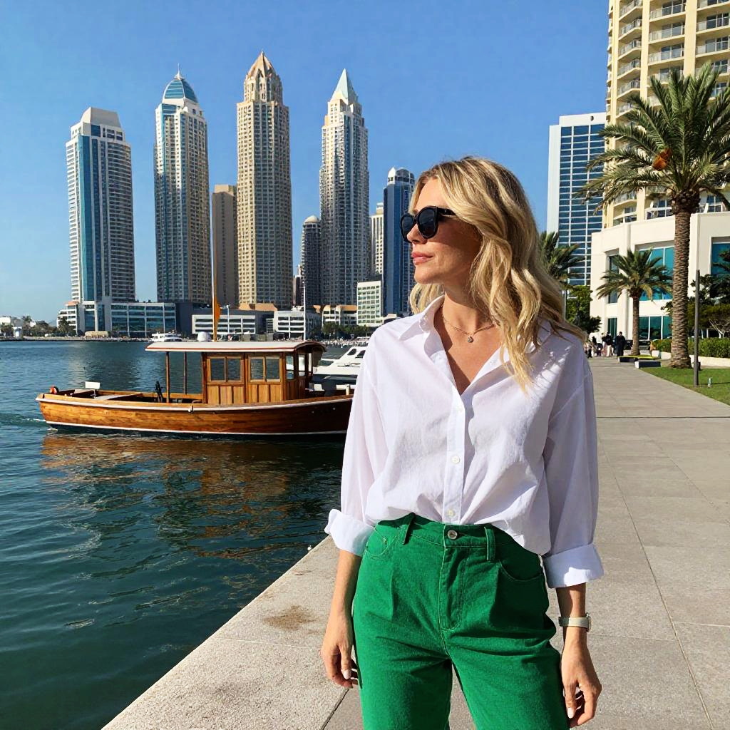 Photograph of a blonde woman with sunglasses, wearing a white button-up shirt and green pants, standing on a waterfront promenade. Behind her, there are tall skyscrapers and a clear blue sky. A wooden boat is docked in the calm water to the left, with a modern building and palm trees on the right. The scene is bright and sunny.