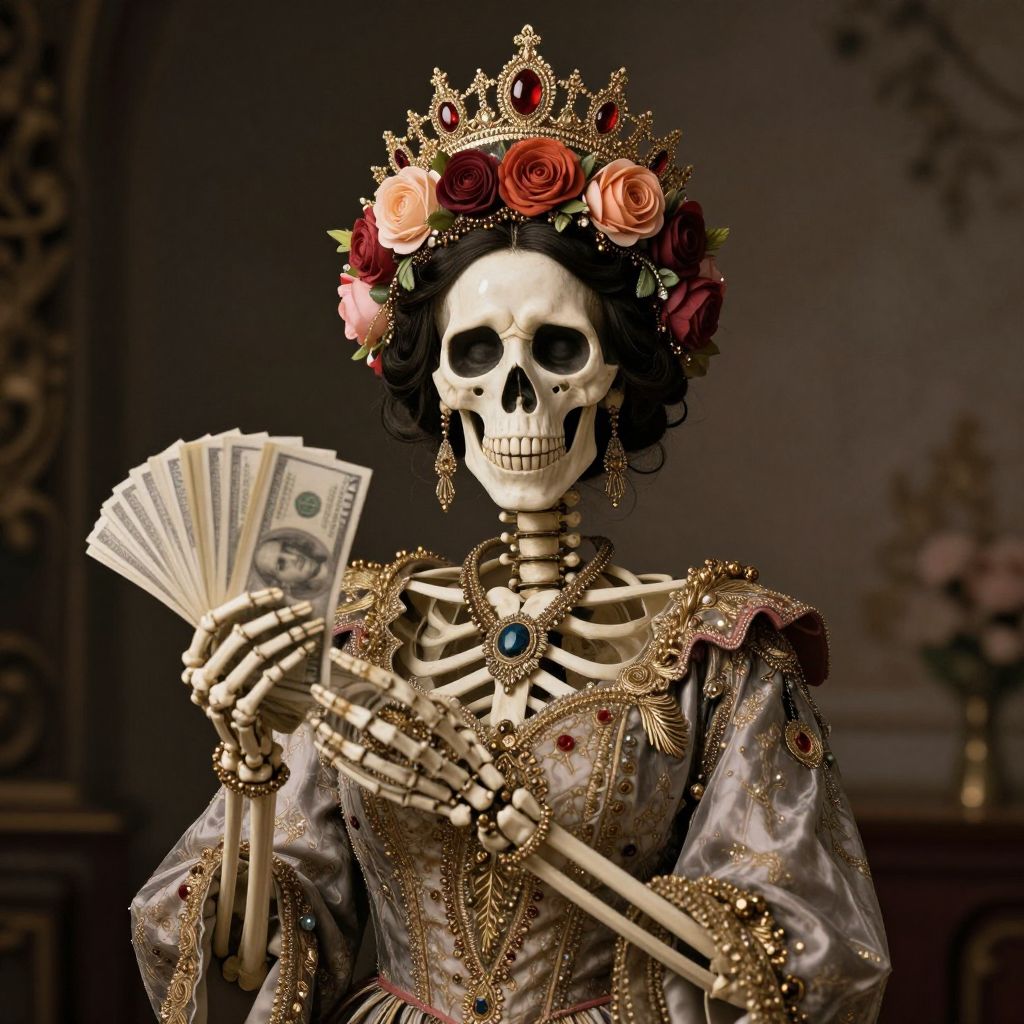 Photorealistic digital art of a skull in a regal gown, adorned with a flower crown, holding a fan of money. Dark, ornate