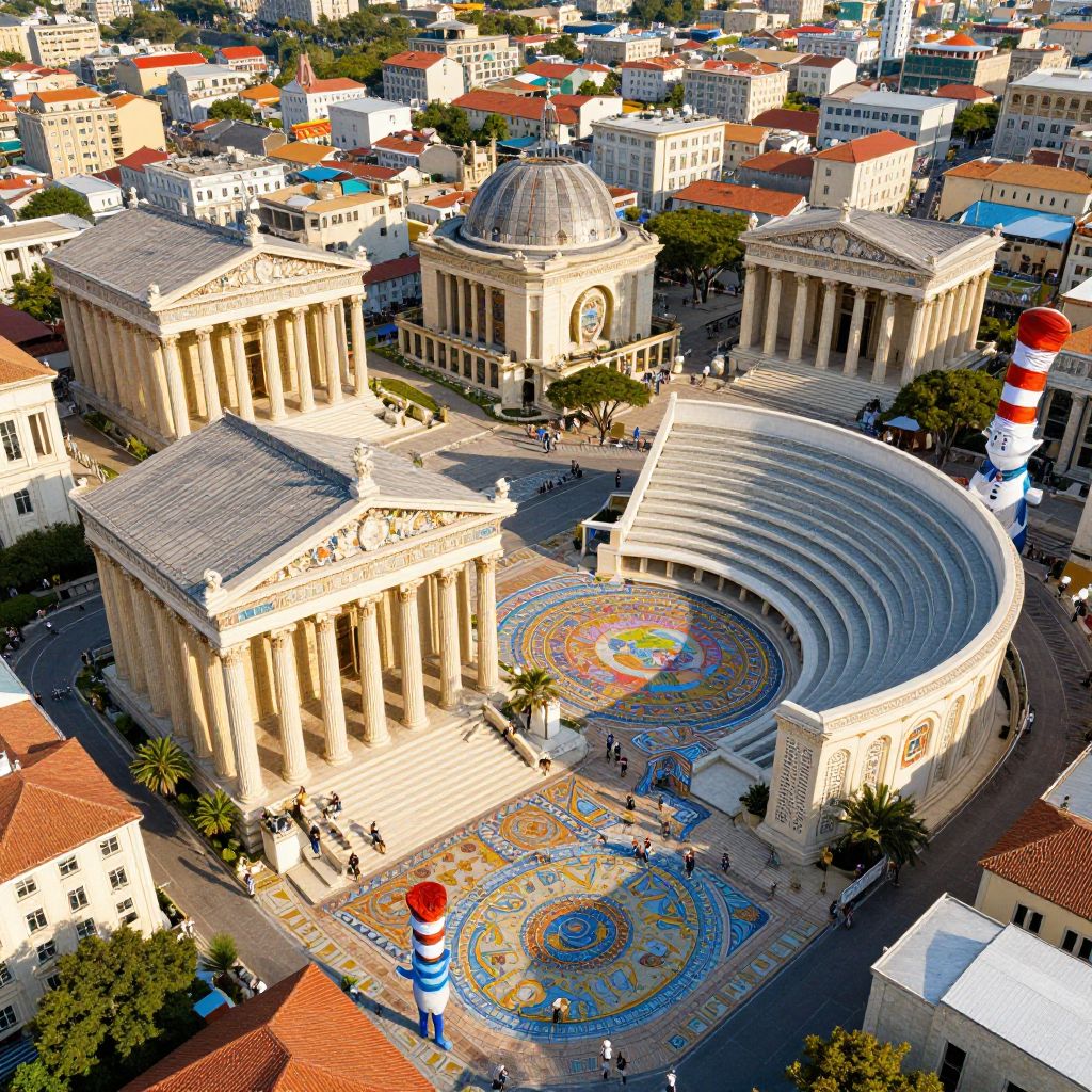 Aerial photograph of a vibrant urban scene featuring three prominent neoclassical buildings with tall columns, surrounded by colorful, mosaic-patterned plazas. The central structure has a large, circular, grey-domed roof and is flanked by two similar buildings. A red and white striped lighthouse stands in the background, contrasting with the red-roofed buildings. People are scattered across the mosaic-covered plazas, adding life to the scene. The surrounding area is densely packed with white and beige buildings, creating a picturesque, Mediterranean cityscape. The image is brightly lit, highlighting the vivid colors and architectural details.