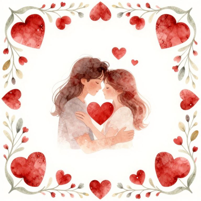 An embrace of love and serenity unfolds in a delicate floral frame, where vibrant red hearts pulse with warmth and hope, inviting the viewer into a sanctuary of timeless affection and gentle beauty.