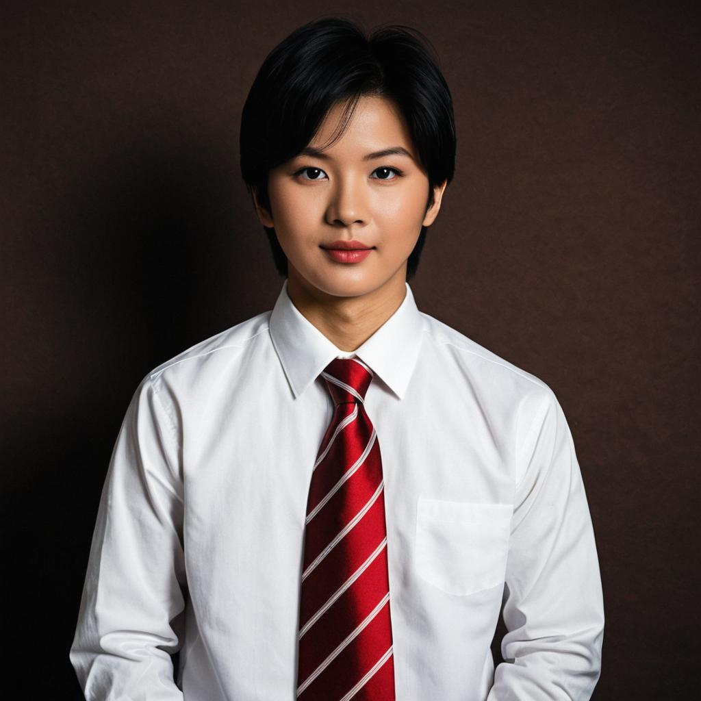 Funny fancy dress man,solo, male focus, 1boy, realistic, necktie, red necktie, black hair, brown background, looking at viewer, closed mouth, white shirt, jacket, shirt, asian, long sleeves, standing, collared shirt