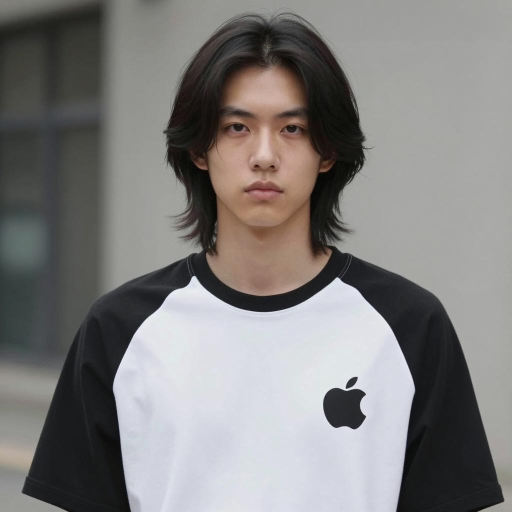 Close-up portrait of a young Asian man with shoulder-length black hair and side-swept bangs, wearing a black and white raglan shirt featuring a circular Apple logo. The subject has a serious expression and is standing in an urban setting with soft lighting and a neutral-colored blurred background. The image captures a natural, casual style in medium shot and portrait orientation.