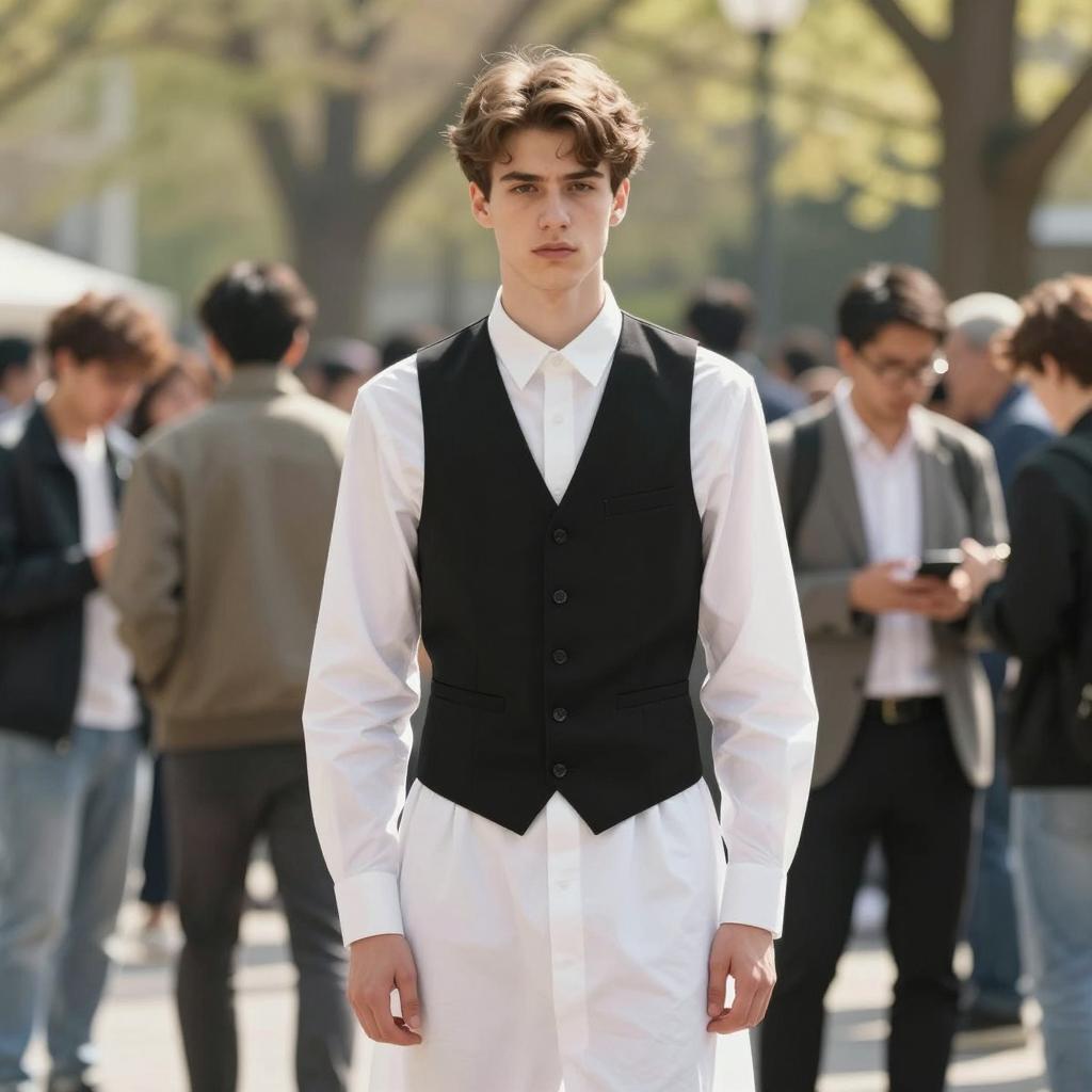 Danny phantom costume shirt, photorealistic, young Asian man, shoulder-length black hair with side-swept bangs, serious expression, wearing black and white raglan shirt with circular Apple , standing in urban background, soft lighting, neutral colors, slight blur in background, realistic ures, casual style, close-up, portrait orientation, natural look, medium shot
