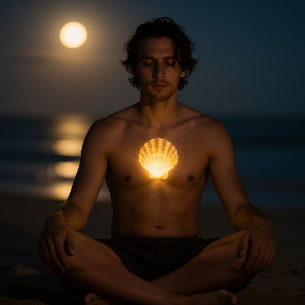 [[man,seashell tattoo]]Moody, nighttime scene on a serene beach, soft golden light from the full moon casting an ethereal glow, illuminating the subject's features. A man sits cross-legged, his eyes closed in contemplation, with a glowing seashell tattoo radiating an otherworldly energy emanating from his chest. The air is filled with an enchant Man has masculine face and piercing eyes