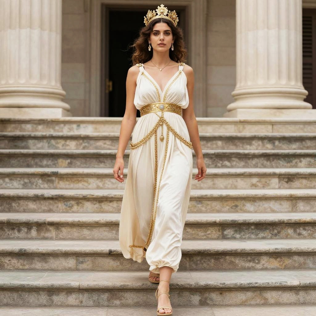 Greek goddess rave, a woman in a dress and crown walking down a set of stairs