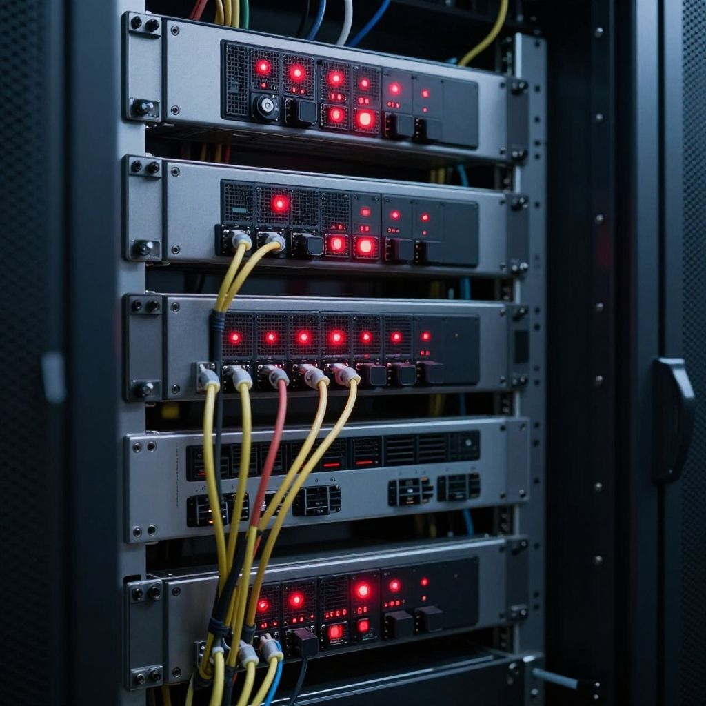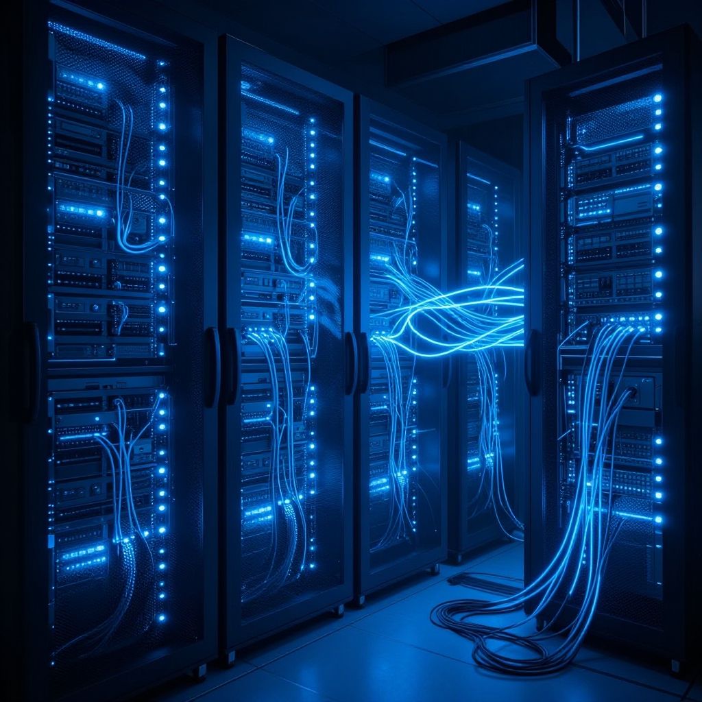 Photograph of three illuminated server racks with glowing blue LED lights and tangled network cables, creating a futuristic, tech-savvy ambiance.