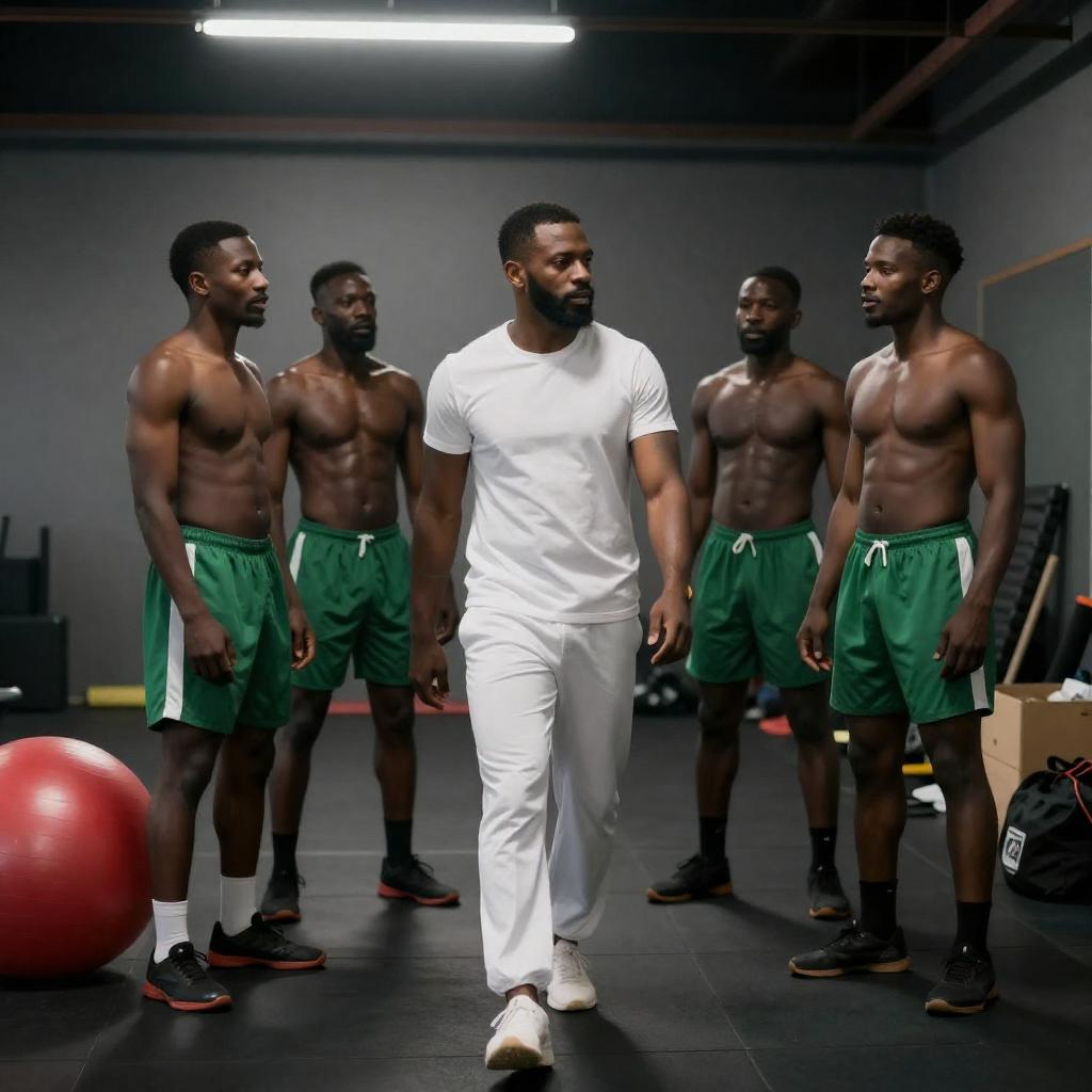 Black-and-white photograph of a muscular, shirtless Black man with a broad smile, standing behind a shirtless, muscular Black man bent over on all fours. They are in an outdoor arena with a crowd of onlookers, including men and women, some clapping. The background includes a multi-story building with balconies. The standing man's expression is triumphant, while the bent-over man's face is not visible.
