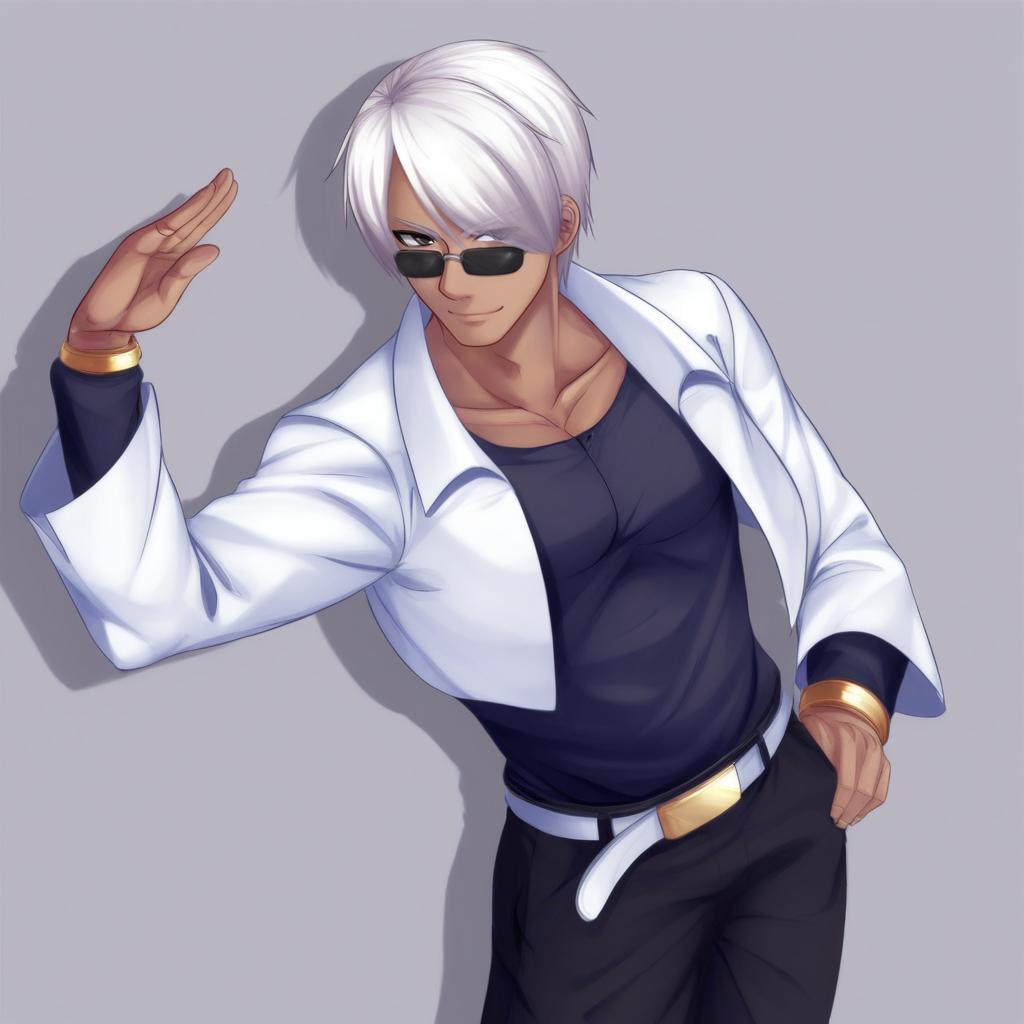 K' (kof), the king of fighters, 1boy, dark-skinned male, white hair, sunglasses, by artist tenneko yuuri, leet