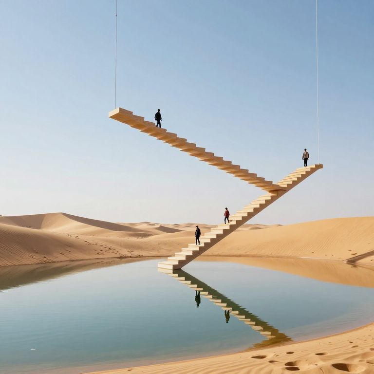 Digital art depicting a surreal desert landscape with golden sand dunes and a reflective, calm pool of water. A long, wooden staircase is suspended in mid-air by two thin cables, angled diagonally from bottom right to top left. Three small, silhouetted figures are climbing the staircase; one at the bottom, one near the middle, and one at the top. The staircase's reflection is mirrored perfectly in the water below. The sky above is clear and bright blue, adding a vivid contrast to the warm, sandy tones of the desert. The overall scene is minimalist and abstract, emphasizing the staircase and its reflection.