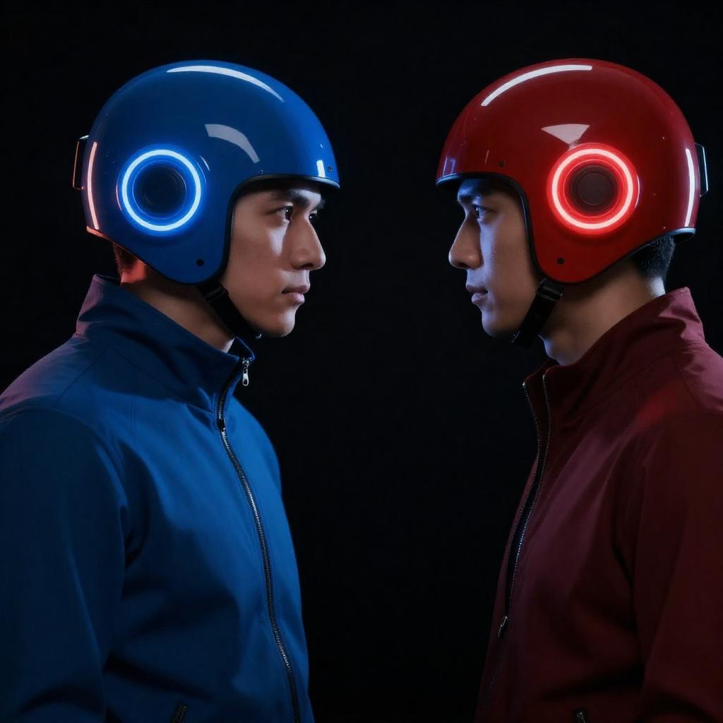 Three people in futuristic, glowing blue suits and helmets. Two adults and one child, centered, interacting closely. Black background with blue and purple gradient. Glowing circuit patterns on suits. Child on left, adults on right and center. Adults looking at child, child looking at adults. Glowing headgear, chest patterns.
