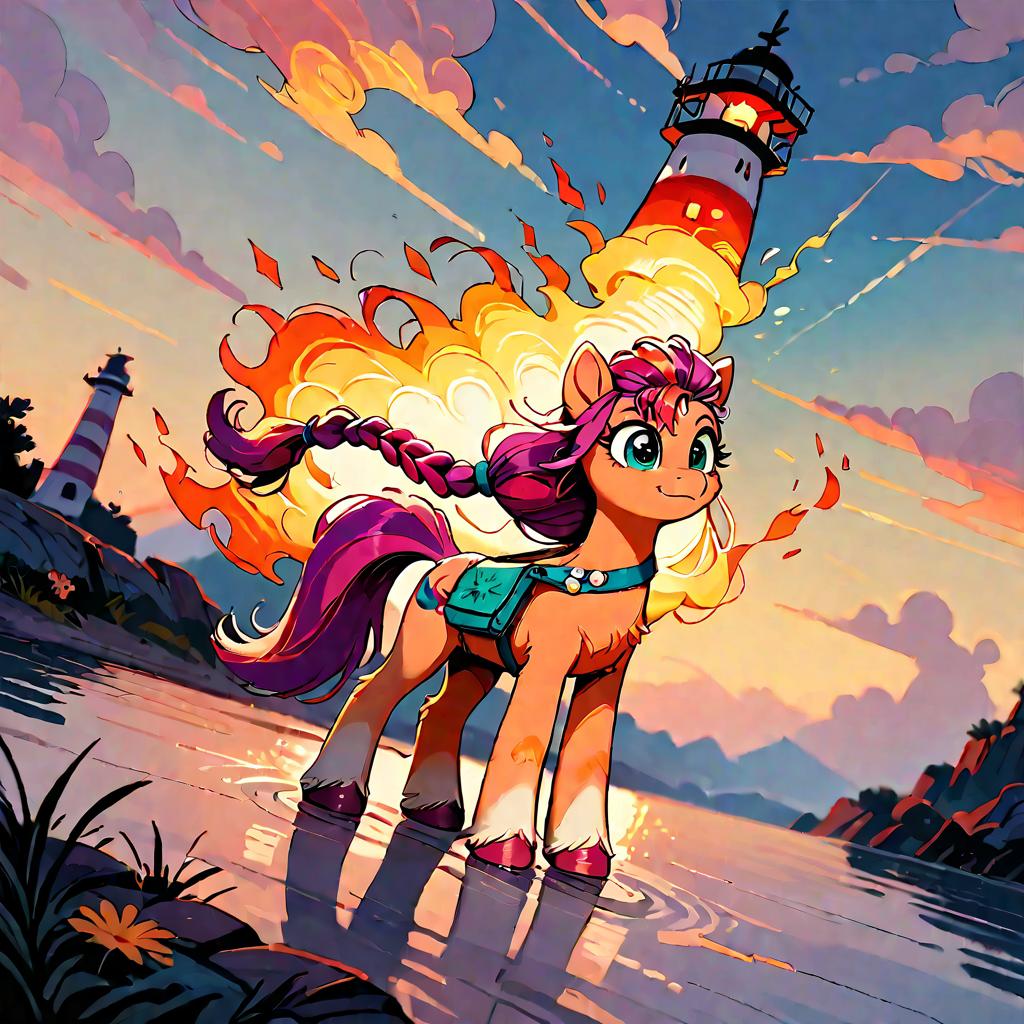 (score_9), pony sunny starscout, (lighthouse background:1.05), very cute, detailed mane and fur, fluffy, (body fur), blurry, beautiful, cloudy_sky, burning_cloud, gradient_sky, dusk, embers, sunset, high detail, digital art style, soft diffused lighting, dutch angle