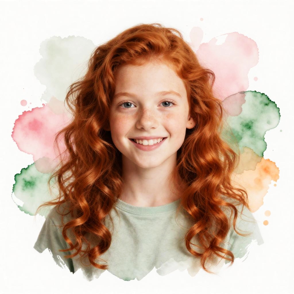 Photograph of a smiling young girl with long, curly red hair, fair skin, and wearing a light gray shirt, set against a colorful watercolor